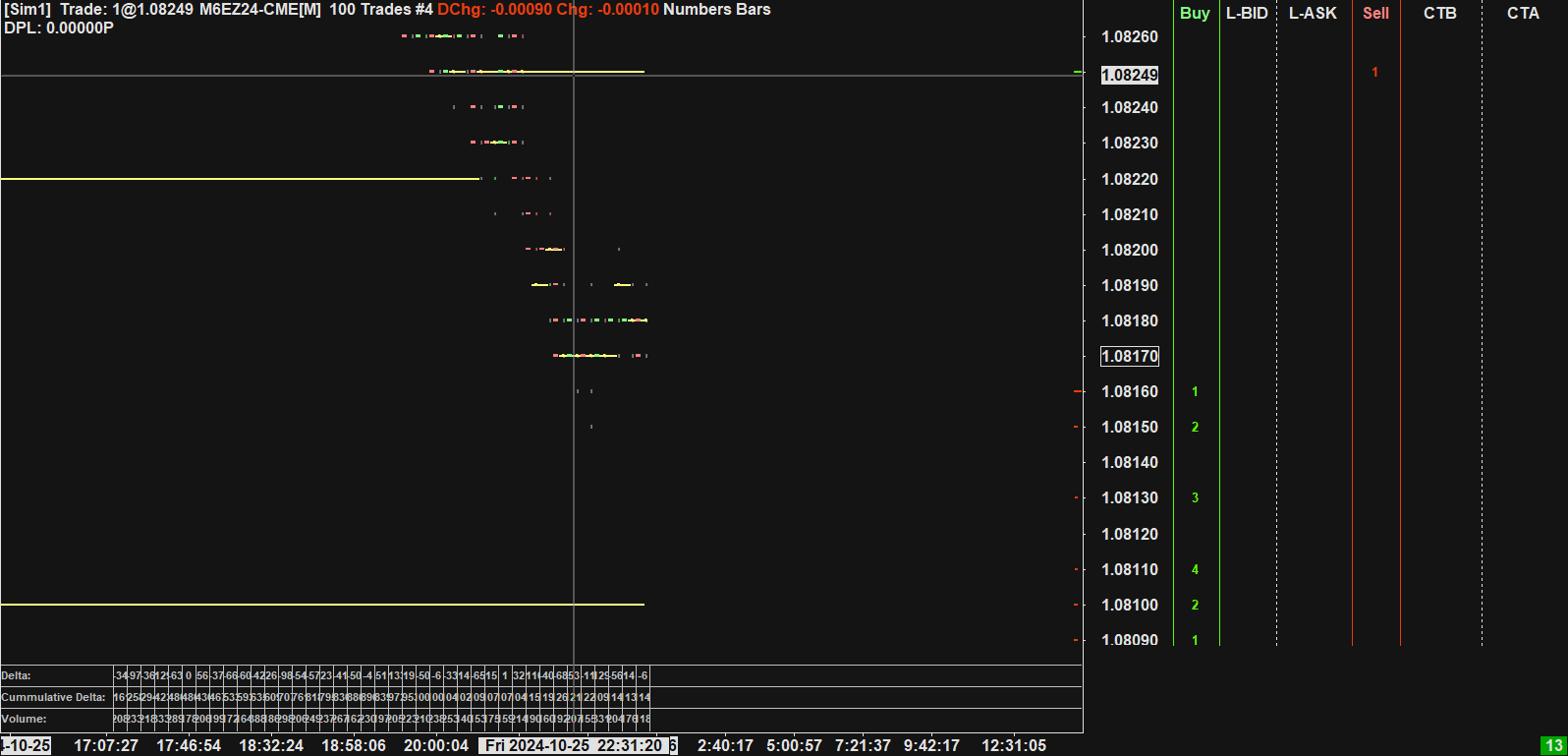 The first thing is that your chart is still too compact, you need to increase the bar spacing in order to be able to view the numbers properly. Refer to the following: Numbers Bars: Scaling a Numbers Bars Chart The other thing we notice is that your "Price Display Format" is set to one additional decimal place than the standard - i.e. you are showing a total of 5 decimal places, but the tick size for this instrument is .0001, therefore you only need 4 decimal places displayed. This makes us wonder if you have changed the tick size. The thing you have to keep in mind if you did is that the Numbers Bars data is still only going to show at the price levels that were actually traded. For the most reliable, advanced, and zero cost futures order routing, use the Teton service: Sierra Chart Teton Futures Order Routing |