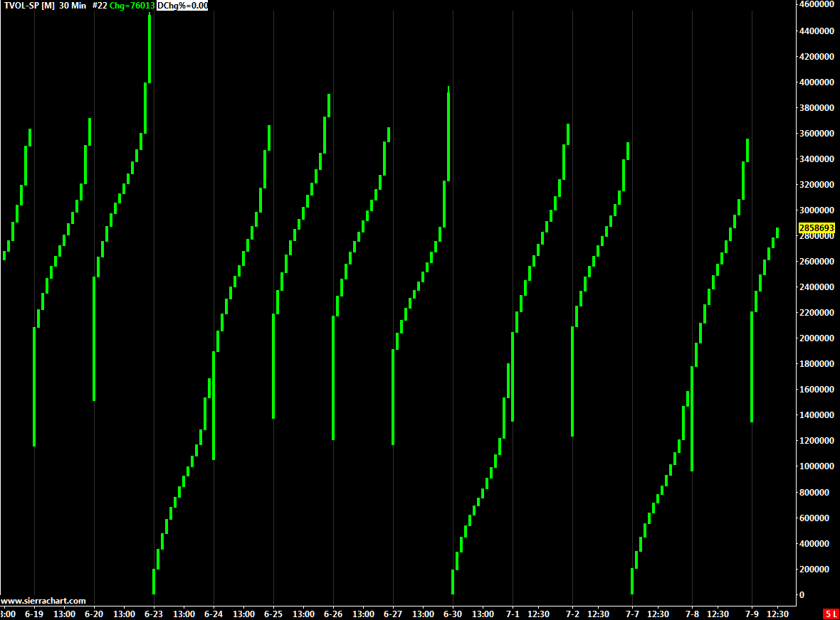 When I change Start Time to 00:00, symbol TVOL-NYSE picks up night volume for some days (see chart link below). http://www.sierrachart.com/image.php?l=1410298268302.png How do I create a 30 minute chart of regular trading hours (09:30 to 16:29:59) volume for symbol TVOL-NYSE. |