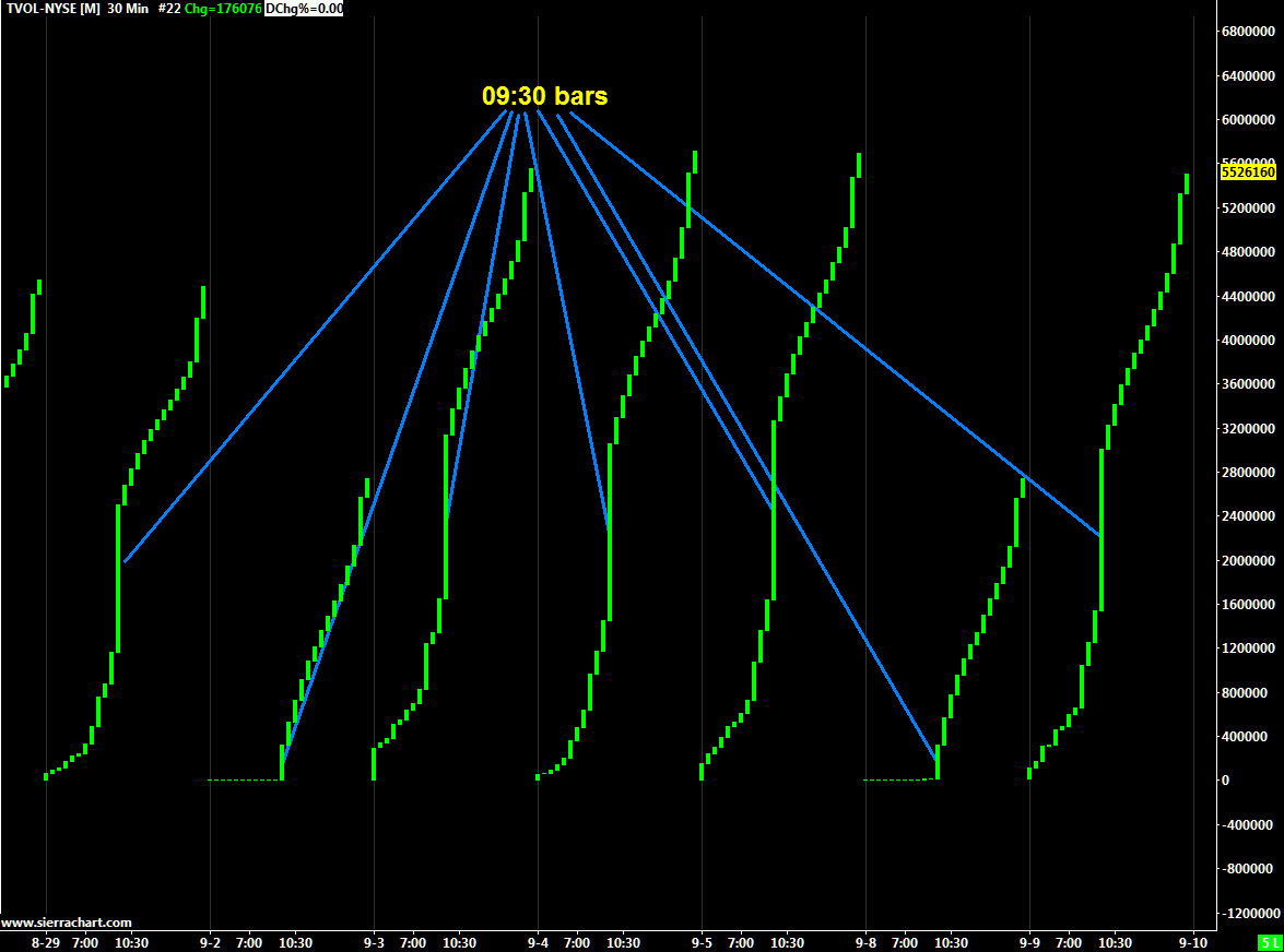 actually looks like the first day after weekends and holidays volume starts charting from zero but subsequent days initial print and charting start much higher.