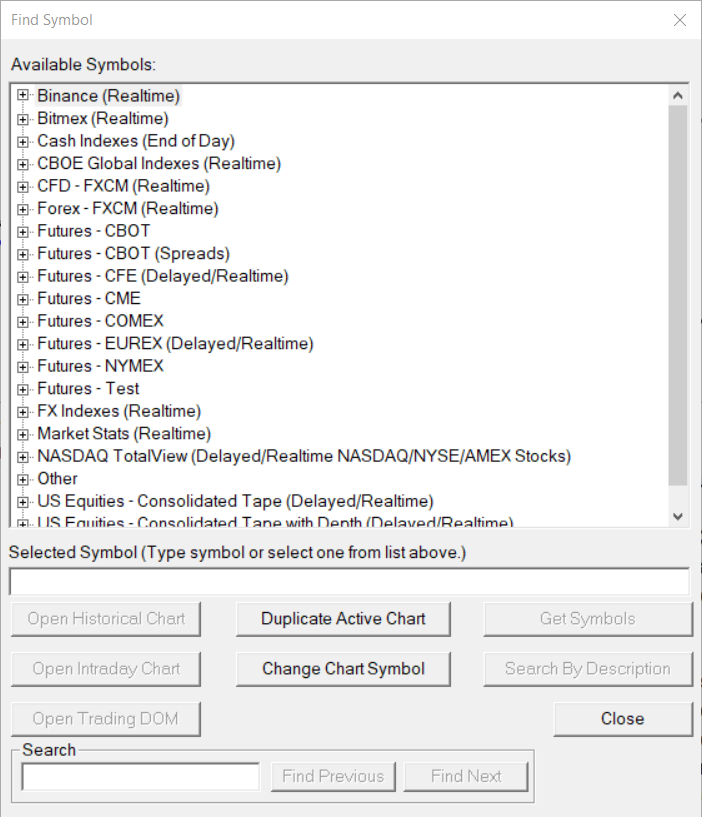 Thank you, when I open find symbols this is not what I see. Is this because of my data fee? I currently under the Denali - Full CME Group (CME, CBOT, COMEX, NYMEX) for non-professional Trading accounts - @ $5.5 per month. Appreciate your help on this matter. |