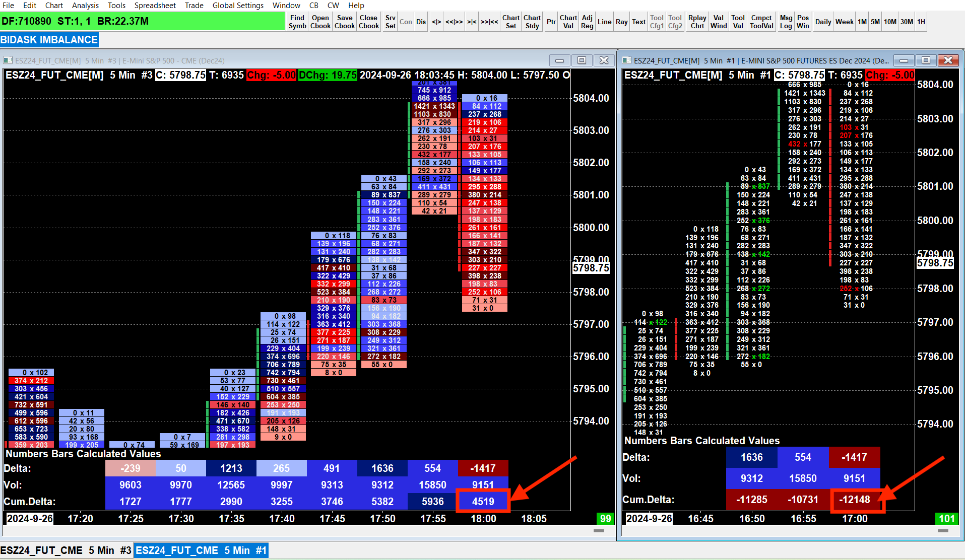 Hi there, I have set up two different charts for the S&P500 e-mini, one being the bid x ask/delta numbers bars and the other is an imbalanc/bid x ask. I have the calculated numbers bars below to show the volume, delta, and cumulative delta on both of the charts and the cumulative delta tends to show two different values on both of the charts. I have attached an image below demonstrating this issue. Any help to solve this issue is highly appreciated. Many thanks, B |