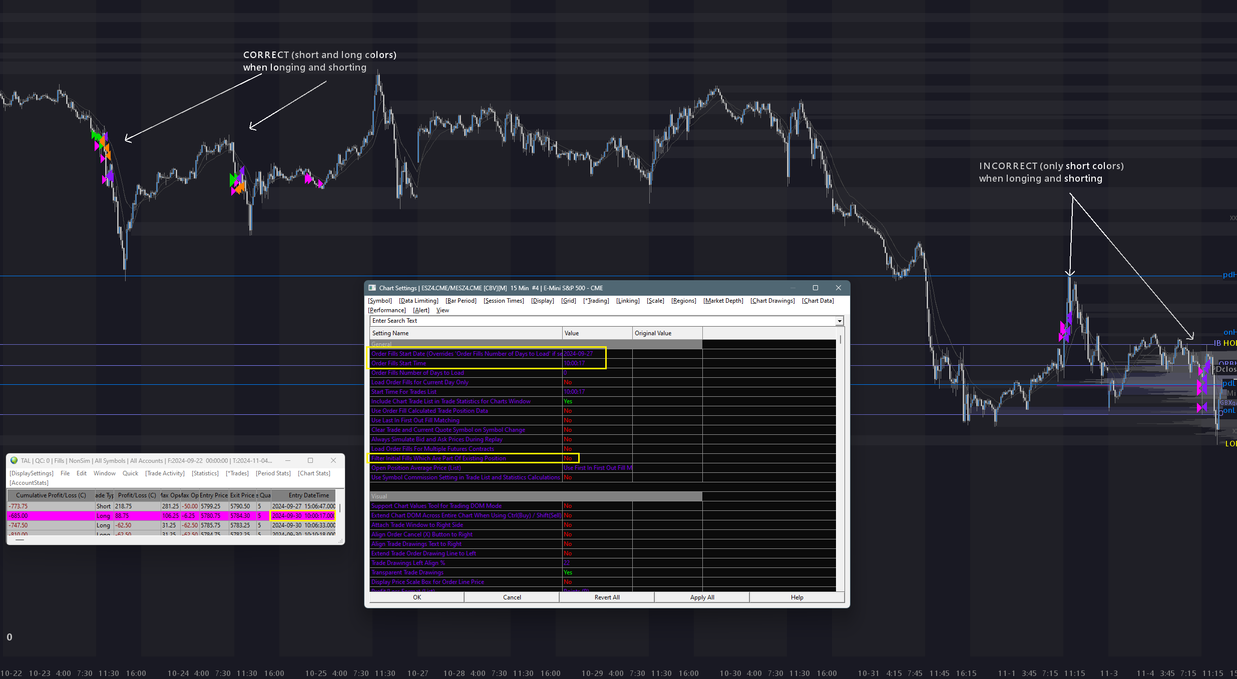 hmm. i applied a position entry date of 2024-09-11 at 09:31:53 (both circled in red). all of my old fills are as they should be, but the fills from today are still only one color (short or long same colors) it is weird because this issue just started happening today when i opened SC after making no changes. any further help is greatly appreciated |