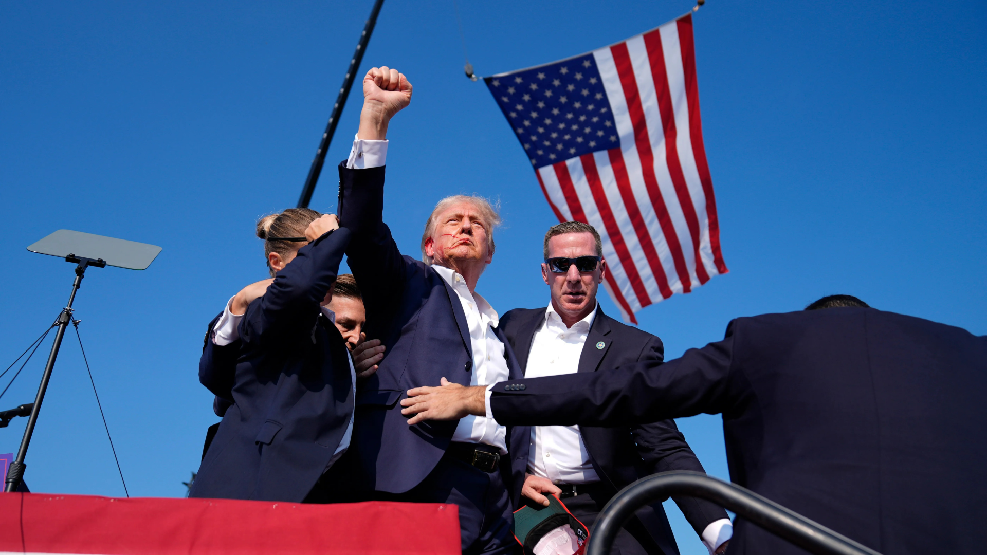 High resolution photo of Trump, with the US flag at the Pennsylvania shooting location, attached.