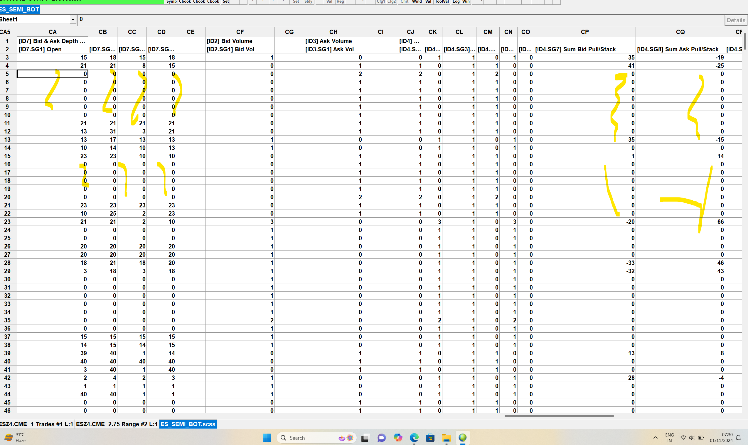 Hello Team, I am trying to use spreadsheet study to build an alert. My chart bar period is set to NUMBERS OF TRADES PER BAR set to 1. I have added below indicators 1. Number bar calculated values 2 2. bid and ask depth bar (sum bid) 3. bid and ask depth bar (sum ask) 4. Ask Volume 5. Bid Volume I have attached the screenshot below where you will see bid and ask depth bar to be zero. Also, the pulling/stacking data is also zero in most of the rows. I want to understand if the data is correctly getting processed and if there is a way to avoid this. Please note, I use Sierra chart with Denali data feed and the screenshot present is of live data (not replay). Thank You |