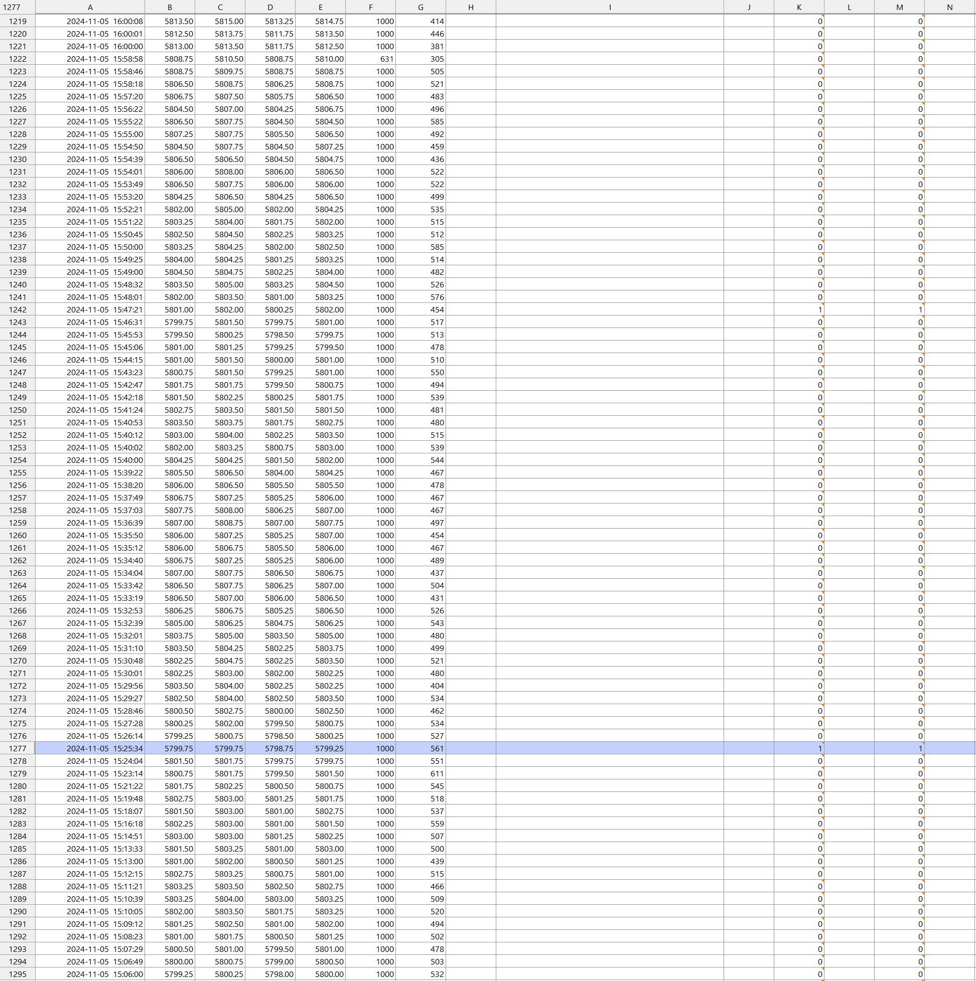 They are at the exact same row with both having 1. For the example I'm looking at, when I look at the signal drawn for the Sell Entry it is about 4 minutes later and all rows above are 0 (where the sell signal is). There is not exact trend other than its usually between 30s to 6 minutes difference and always after the buy entry in terms of time. |