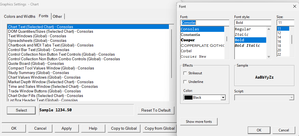 For the chart that shows this issue, please select "Chart >> Graphics Settings" and if the option for "Use Global Graphics Settings instead of These Settings" does NOT have a checkmark next to it, then please tell us what the "Fonts >> Chart Text" font is set to. If there is a checkmark next to "Use Global Graphics Settings Instead of These Settings", then close that window and select "Global Settings >> Graphics Settings >> Font" and tell us what font is being used for the "Chart Text". For the most reliable, advanced, and zero cost futures order routing, use the Teton service: Sierra Chart Teton Futures Order Routing |