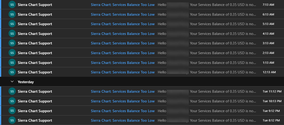 Hi Team For the Month of data feed payment I have already done. And current month is not even completed first week of the month. Then all of sudden why I have received 10 emails today alone with email message content is as below? *********************Quote End************* subject: Sierra Chart: Services Balance Too Low