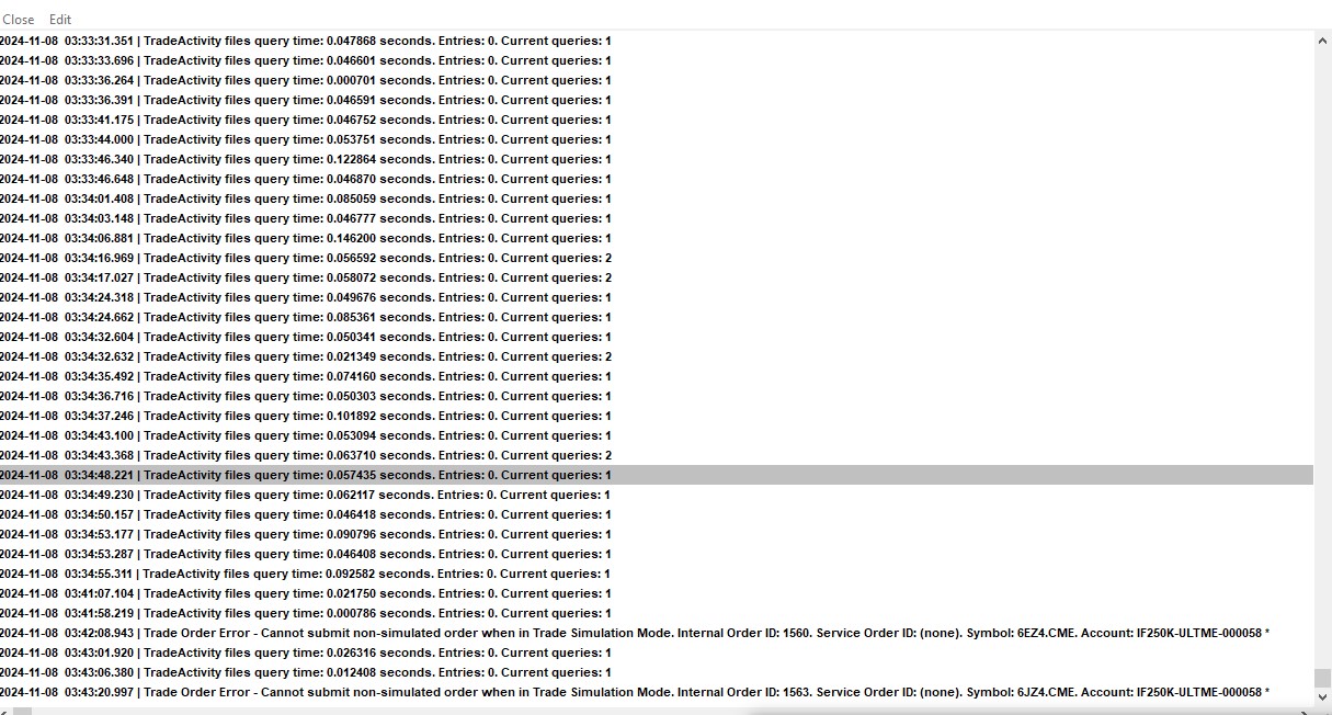 According to your log, you have the option for "Trade >> Trade Simulation Mode On" enabled, but you have your live account selected. Therefore the system will not put in a simulated order since the account is wrong. On the other hand, if you want to submit your order through Rithmic, then you need to turn off the option for "Trade >> Trade Simulation Mode On". Refer to the following: Overview of Trading: Difference between Simulated and Non-Simulated Trading Modes For the most reliable, advanced, and zero cost futures order routing, use the Teton service: Sierra Chart Teton Futures Order Routing |