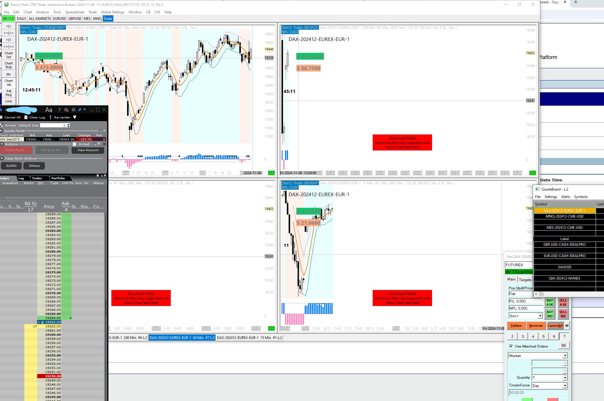 Hi, I am using IB as broker and data provider, DAX contracts not updating, I get some error messages. Two days ago it was updating on chart but I had issues with getting historical data. You can see in screenshot that IB booktrader is realtime, but SC charts not updating. I have updated Sc to latest version, I have checked symbols amd downloaded it from server. Best regards, H. |