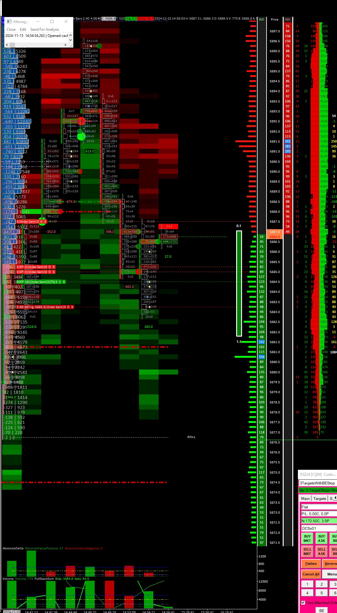 Orders 2024-11-21 09:44:34.094514 ESZ24 Unspecified DCSx00 ESZ24 [C][M] Custom Absorption Bars 2.40 4.00 #2 | User order entry | Unable to Flatten/Reverse. There are working Market orders that will flatten the Position. Working non-market orders will be canceled 2024-11-21 09:44:34.094512 2TargetsWithBEStop.twconfig 0.00 Day N As you can see, no additional market order is being sent. Maybe, you are not getting the updated position quantity (Due to network connectivity issues) and you are getting confused by this. It is clear what the problem is. There is a network connectivity issue to the Trading Evaluator server. We have changed the network connection for that to a different ISP. Let's see if that helps in your case. These are child orders of the main parent order and it means that the main parent order has not yet filled and they are in a pending state. There is nothing unusual about this: What do those "Pending Child Server" Lines mean?