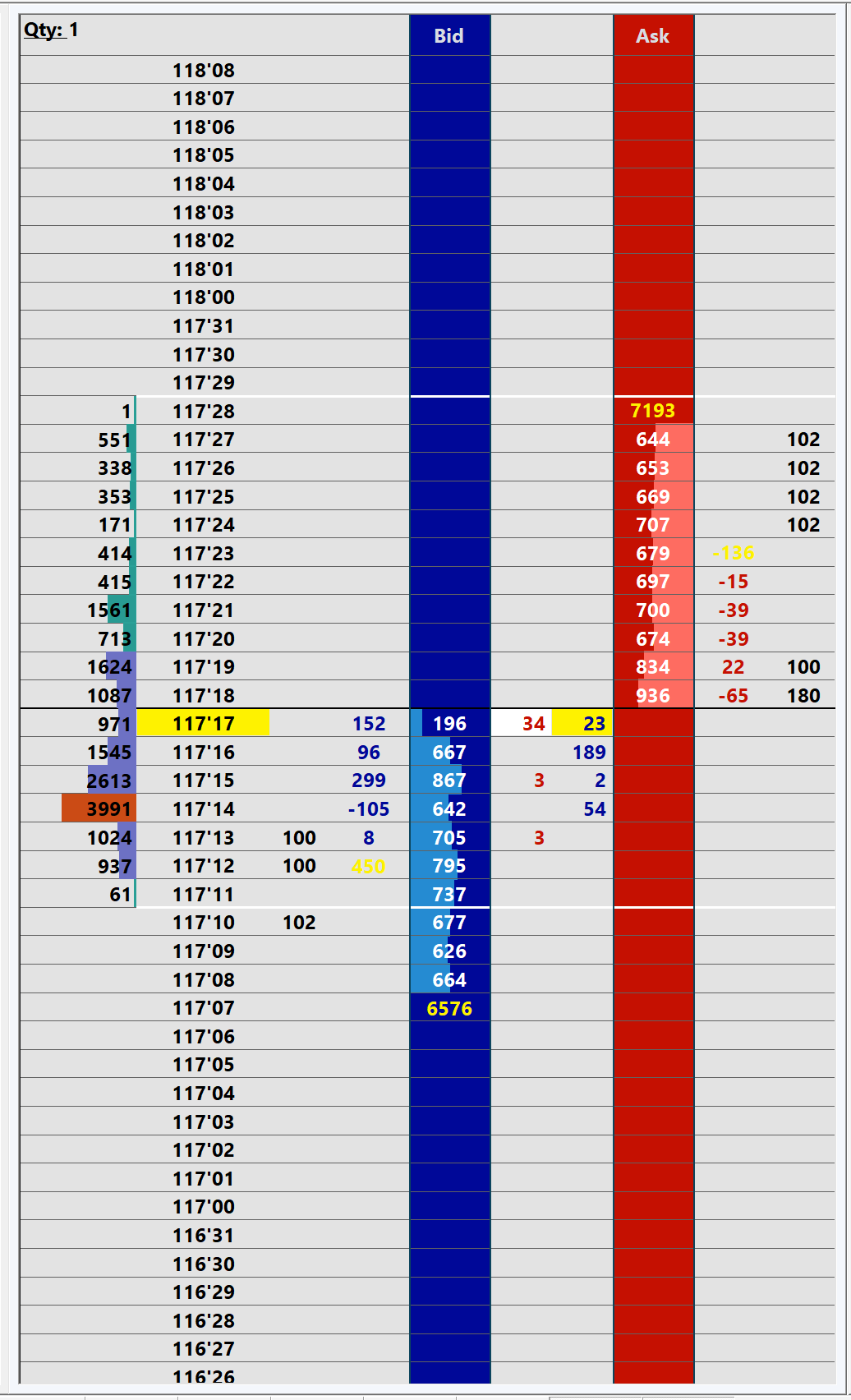 On the Trade DOM is it possible to DISABLE the sum/total of pulling/stacking column? See the yellow numbers in columns 4 and 9 (counting from left to right). Also, is it possible to change the background color of the values scale text based on whether the market has traded at that price today? I’ve attached a screenshot from another program that shows what I mean, i.e. the background is gray for prices that have been traded at today, and the background is black for prices that haven’t been traded at today. |