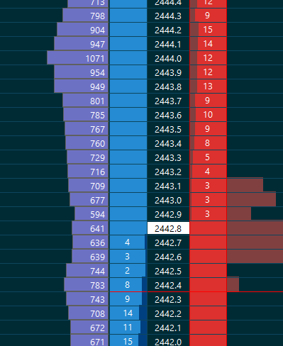 I am attempting to get the bid/ask spread highlighted (see attached image), where Bid: 2409.10 Last Price: 2408.90 Ask: 2408.80 In the video above, the colored bars that are moving above and below the price - that is what I am trying to do. However, as shown in my DOM image in the prior post - it is just price (white) without the spread being highlighted. Date Time Of Last Edit: 2024-11-12 18:53:35