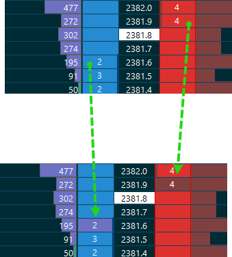 Okay, THIS is what I am attempting to do. I want my DOM (one the top) to look like the one on the bottom (PhotoShopped), where the current bid/ask spread is highlighted. |