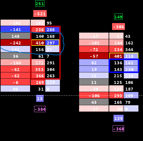 With diagonal delta the dominant side makes no sense to me. "Negative values do not necessarily mean that the bid is dominant, the diagonal Ask could still be larger at that level" that is the reason dominant side makes no sense to me. Specially at the POC you get misleading readings, because usally both sides at this level are dominant. See attached file, the bid side 156 to ask side 297 is ignorde but it is a positive delta of 141. When price is moving fast you would miss this information. I am just looking for a the + or - value of the diagonal delta a each level from the bid side.