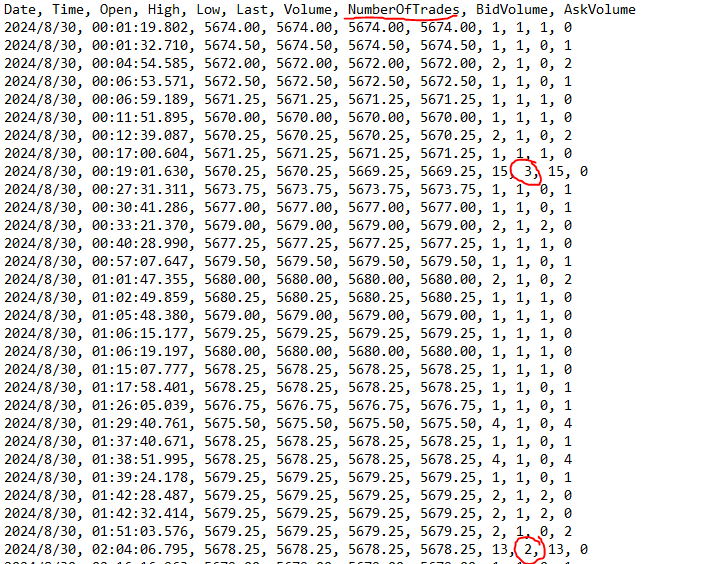 As to what exactly the data is depends on how you exported it. But, from what you state, it sounds like you must have selected "Export Intraday Data To Text File". In this case, what you are seeing is the stored data, which is stored at the increment you define in your setting for "Intraday Data Storage Time Unit". Assuming your time increment in 1 tick, then what you are seeing is every individual trade for that symbol. Items with the same millisecond were traded within the same millisecond and then are denoted by a counter that is added at the microsecond level, which is why you might see things like .123001 .123002, etc. The BidVolume and AskVolume are the trade quantity traded at that bid or ask, meaning it was either a Buy (Ask) or a Sell (Bid). For the most reliable, advanced, and zero cost futures order routing, use the Teton service: Sierra Chart Teton Futures Order Routing |