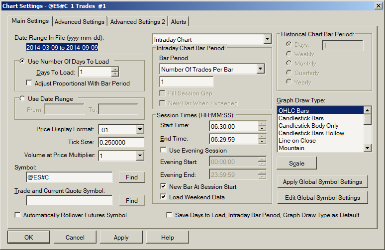 this is my third request for help on this topic. i am still not able to export tick data on the ES continuous contract futures over DTN IQ. -i followed the procedure here: http://www.sierrachart.com/index.php?l=doc/doc_TickbyTickDataConfiguration.php to set tick resolution -i have configured the Chart Settings according to the attached screenshot -i did a fresh 'Delete All Data and Download' -i disconnected from the data feed and performed the export Edit>>Export Intraday Data to Text File attached is a portion of this .txt export. notice how the OHLC are not all the same, and how column C (Open) becomes zero on 3/13/14. i am also attaching a screenshot of the ES chart. please advise on what i am missing here. |