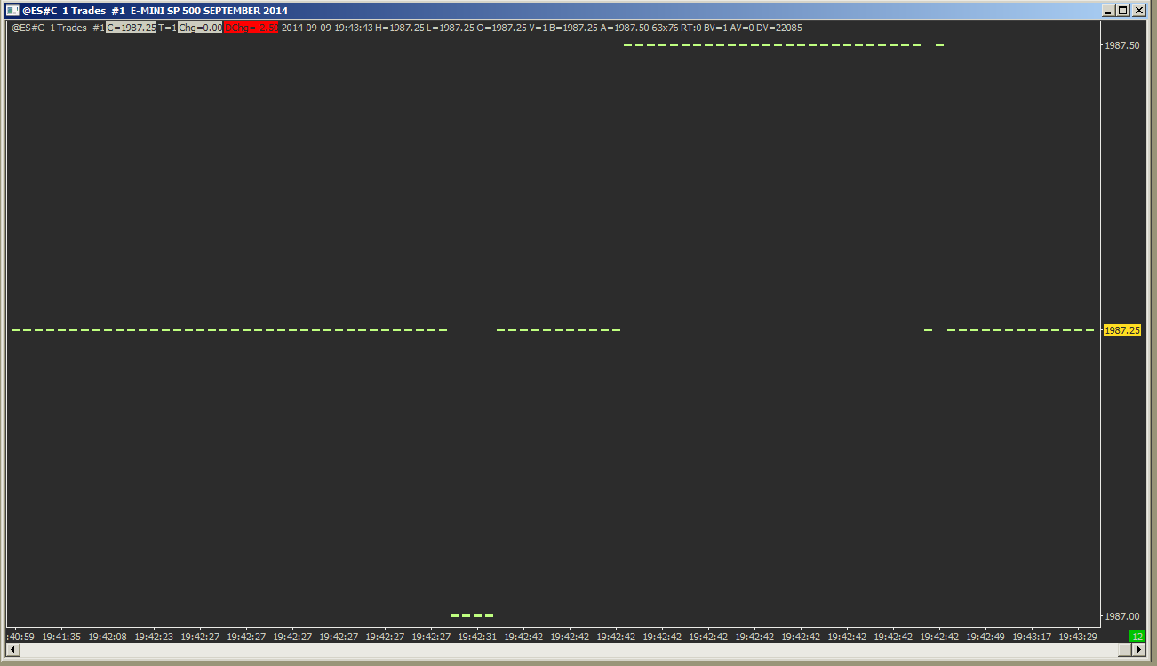 Actually you what you do have is tick by tick data from 3/13/14 onward because the High and Low are the Ask and Bid respectively . And the open will be 0. The last trade price is held in the Last column. So this is a tick record: 3/13/2014 8:17:32 0 1855.25 1855 1855 1 1 1 0 Notice how the number of trades is 1. Sierra Chart Support - Engineering Level Your definitive source for support. Other responses are from users. Try to keep your questions brief and to the point. Be aware of support policy: https://www.sierrachart.com/index.php?l=PostingInformation.php#GeneralInformation For the most reliable, advanced, and zero cost futures order routing, *change* to the Teton service: Sierra Chart Teton Futures Order Routing |