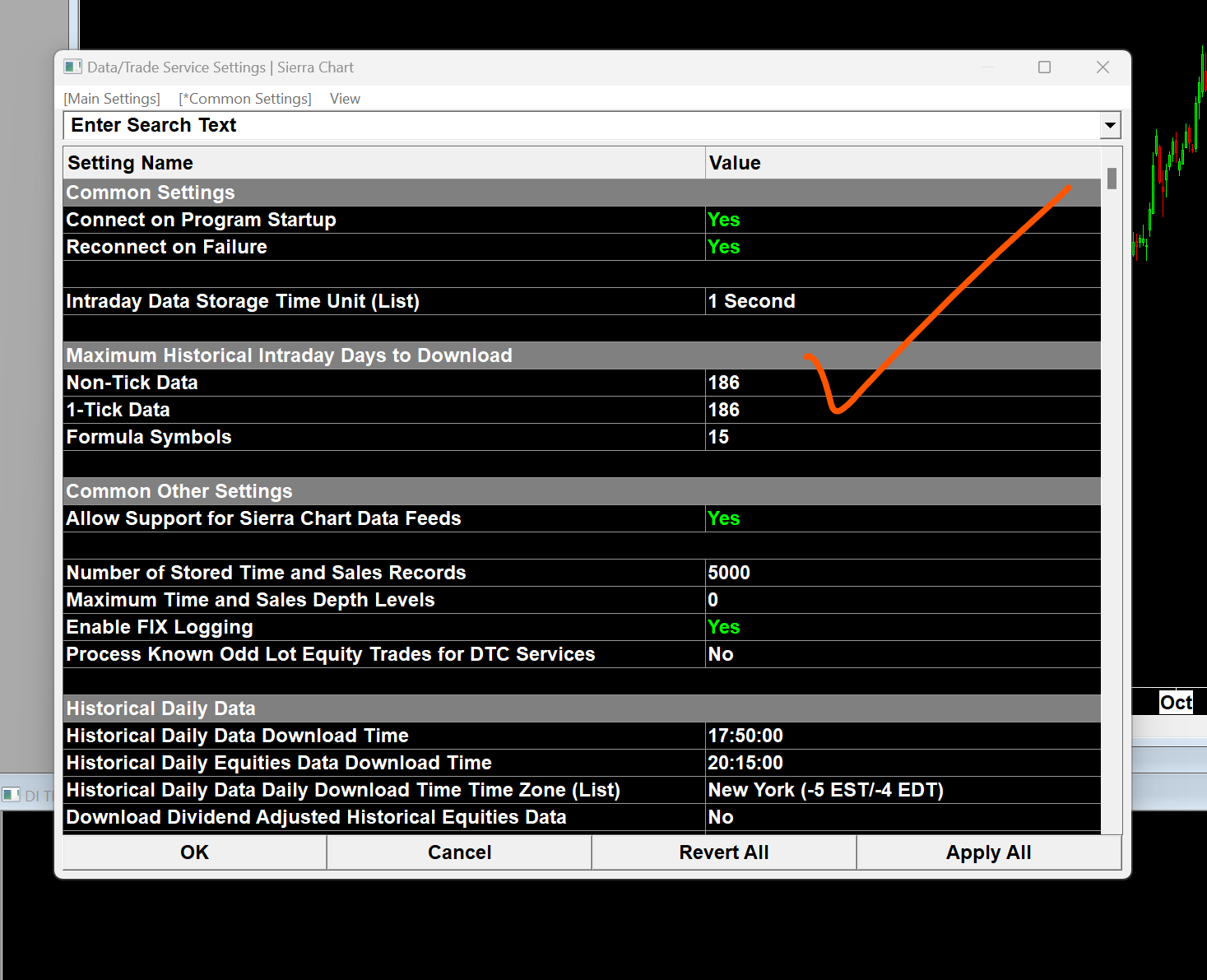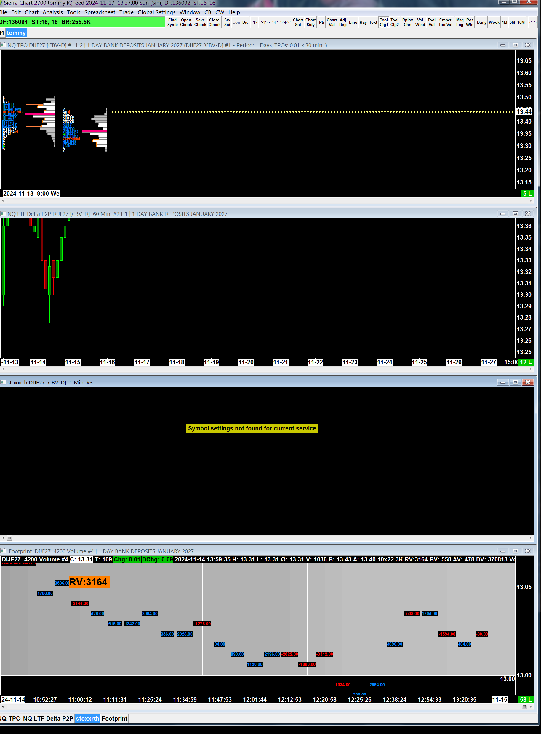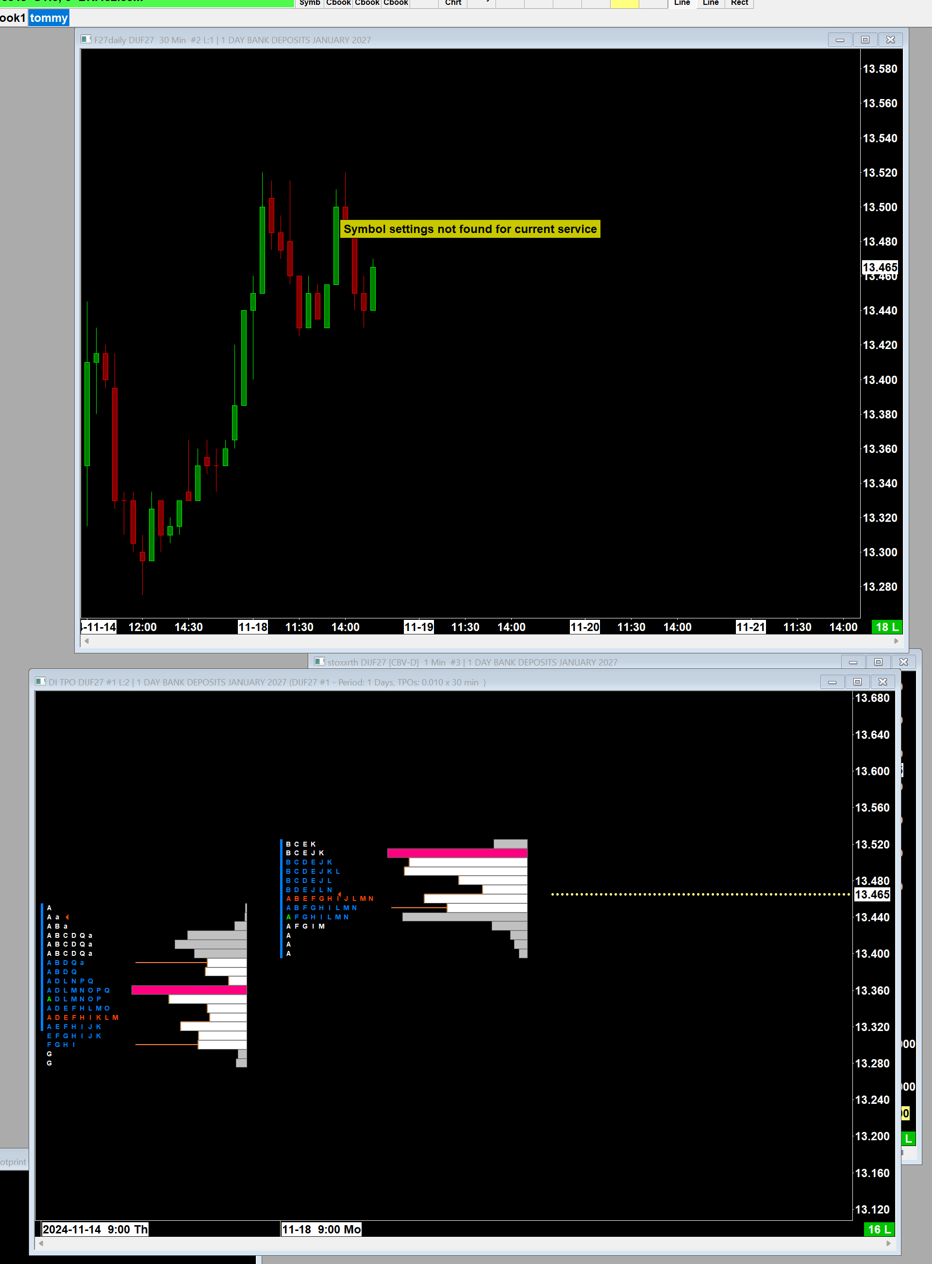 With regards to the "Symbol Settings Not Found for Current Service" that is occurring because these specific symbols are not setup within the system, and they will not be. You will just have to put up with that message for the first 2 minutes and then it will go away. With regards to the data, do not worry about the TPO. Start with a standard intraday chart for that symbol (30 minute bars is fine). It looks like you only have the same amount of data loaded for that situation as well. In this case, follow the instructions at the following link to get more data loaded: Historical Intraday Data (Missing Data / Download Errors / Viewing More Data): Downloading/Viewing More Historical Intraday Data For the most reliable, advanced, and zero cost futures order routing, use the Teton service: Sierra Chart Teton Futures Order Routing |