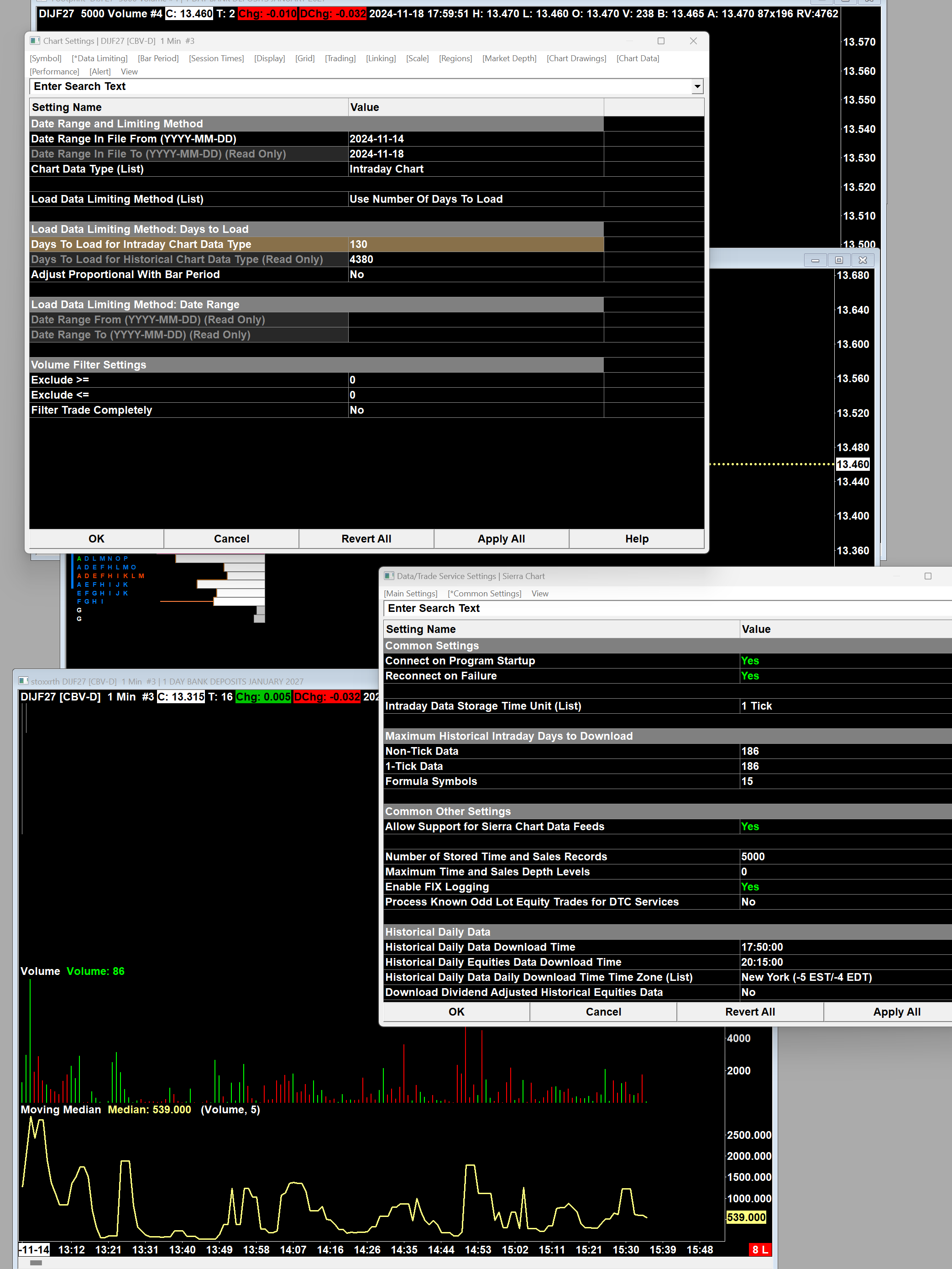 John, I have done all your instructions asked this morning(I actually did it all yesterday, but to make sure I didn't make an error I did it again). 1- the data limiting is set to 'use number of days to load' 2-days to load are 130 3-I then went to Global Trade service and I have non tick data set to 186 4- I also have set 'allow support for SC data feeds' to NO as per instruction I found on google (I tried it both NO and YES and neither work) 5-finally I did the green highlighted necessary step and I deleted and downloaded all data. As you can see from screenshot I hopefully have followed your instructions to the letter and still it is stuck at the 18th of Nov! This is a simple one-minute chart with nothing but 2 SC studies on volume. Again the daily historical data loads but NOT the intraday. Please advise as I have done, I think, all you instructed. THANK YOU, Karen |