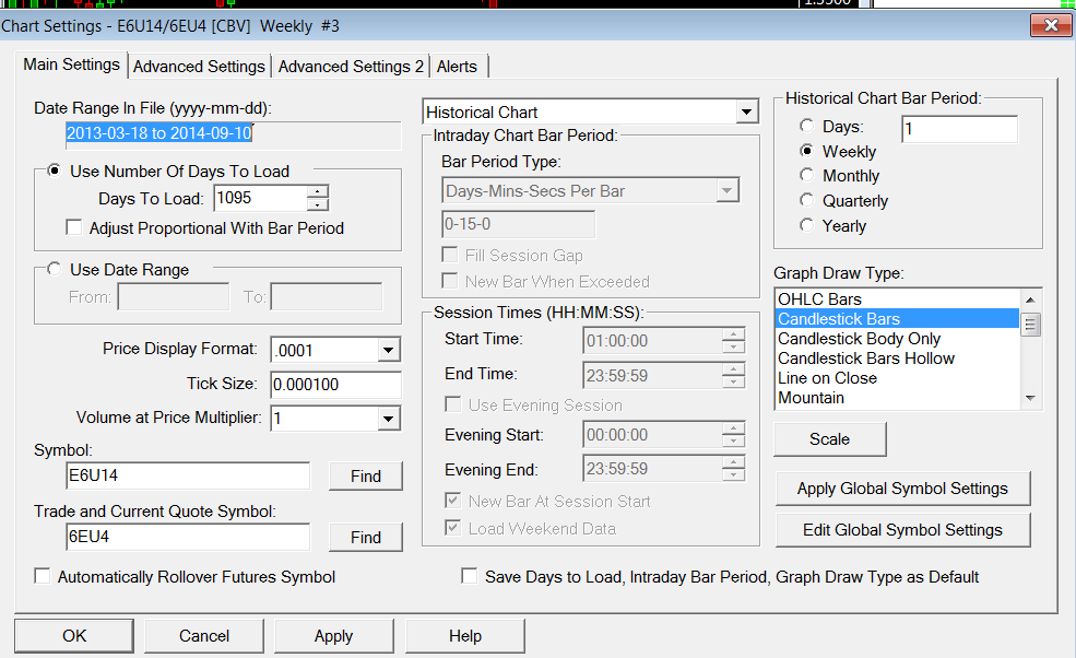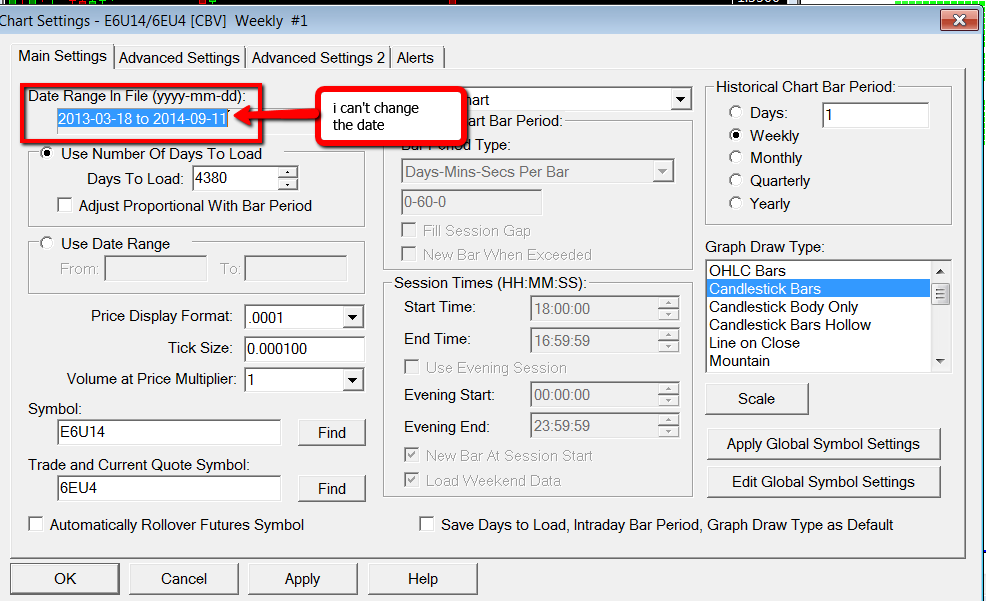 I'm trading the 6E future contract. On this contract i'm able to get history data until 16.9.2013 (see picture attached). I would like to get historical data from 2012 how can i do it? I wasn't able to change the date on the chart setting (see picture attached) |