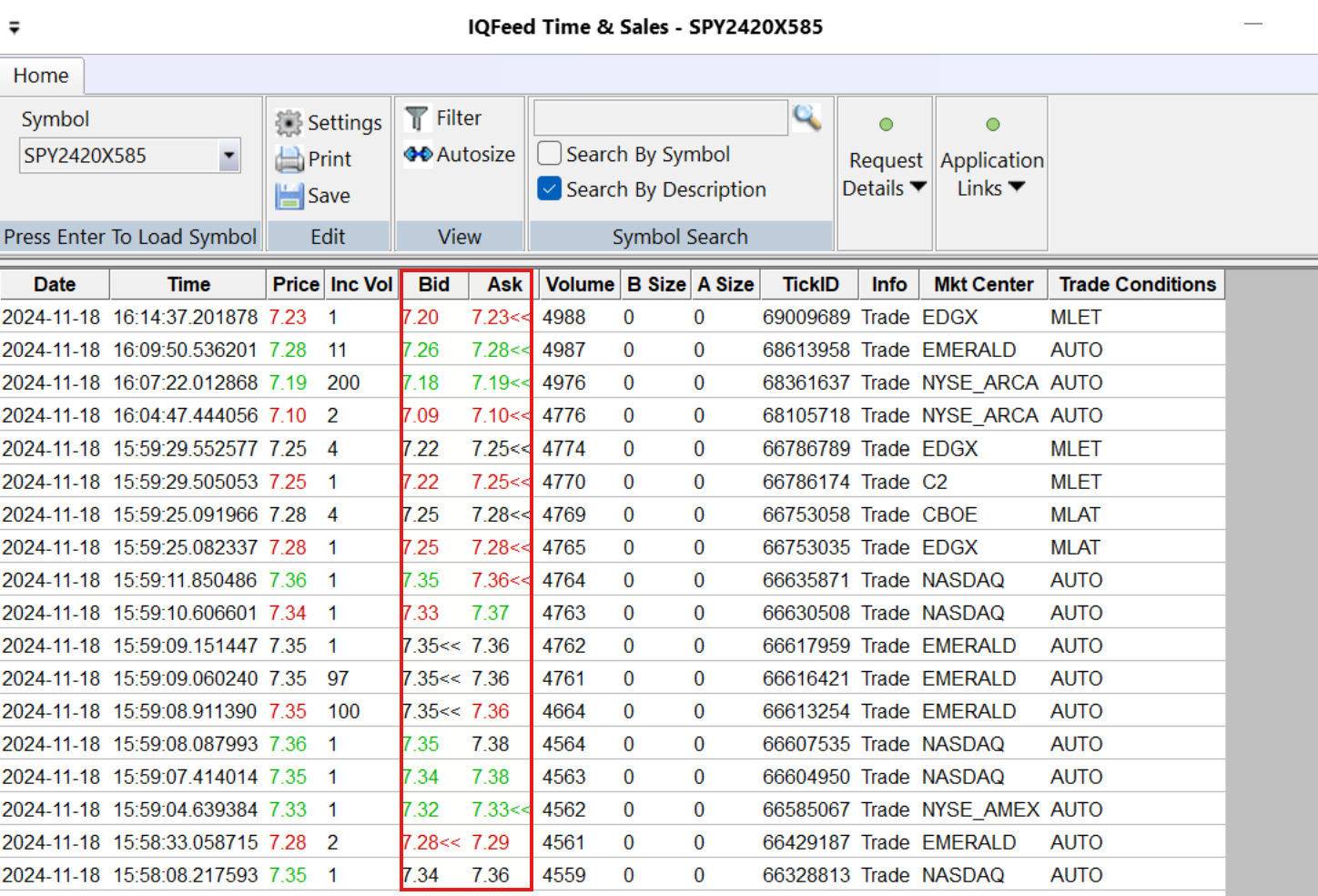 Thank you for the reply and sorry I wasn't more specific about the option type. I'm talking about equity and equity index options. I'm aware that Denali provides CME futures options. So I'd have to use IQ feed. As far as plotting prices other than "last", in fact, bid or ask price would do as well if mark is not available. Mark is a calculated value in option chains anyway that tends to be the average of the NBB and NBO, but it can differ between brokers. The main issue I'm trying to solve is created by the fact that I conduct analysis on the underlying but trade the single long option for leverage for this group of strategies. The underlying and its option do not have the same amount of liquidity and volume. Therefore, in a very small timeframe e.g. a 5-tick option chart mirroring, say, a 500 volume underlying chart, the underlying may print an entire consolidation pattern but the option chart may show a single horizontal line or a single bar simply because far fewer transactions have occurred in the option as compared to its underlying. So it makes no difference whether and how you "ratio" the underlying vs. option chart aggregations, and whether you use a time-based, tick/transaction-based, or volume-based chart. Still the same basic issue. Without the option chart forming a pattern similar to the underlying chart, it's tough to determine, say, stop location, and get risk off. However, while the underlying is printing those bars in a consolidation pattern, the option bid/ask/mark quotes are, in fact, ticking up and down, very closely mirroring the underlying. So plotting those quotes would solve the problem. The standard option chart won't print those movements because it's based on last price and no transactions are occurring. So, if we could plot bid, ask, or mark instead of last on the option chart, we'd be all set. I have consulted with DTN and they say their streaming price data is based on last (as expected), but they do save bid/ask history data so nothing needs to be calculated (i.e. mark) by using an API call. That's the good news as far as historical charting. The bad news is that they only save the bid/ask history on _transactions_, which is not what we want as per above. The bid/ask data _is_ available on the stream as quotes, but it's not saved unless a transaction has occurred (Please see screenshot). So, the only way to plot all bid/ask data regardless of whether transactions are occurring or not would be to scrape it via code from the IQ feed stream. This is all according to DTN tech support and market data team. Which brings me to the question: Based on your reply, it does sound like SC might have the ability to plot the bid or ask (or even the mark-equivalent with the -BAAVG suffix) in real time from the stream, and then save it in an .scid file. That would be the equivalent of the scraping code that DTN support is talking about. The studies you mentioned look very helpful as well, but I'd like to double-check the data recording mode functionality. I've read the docs. It says: "These data recording suffixes affect the method by which Trade (actual trades) and Quote (Bid and Ask) data are written/recorded to an Intraday chart data file". That sounds like either can be done. If that's accurate, then how do you differentiate between using the suffixes for trade / actual trades as in to plot the bid price only when a trade has occurred (which is not what we want as per above) vs. to plot bid or ask quotes regardless of whether trades are occurring or not (which is what we do want)? Is following the instructions under the "creating a 1-tick bid or ask chart" subheading be sufficient? Thanks again. Much appreciated. |