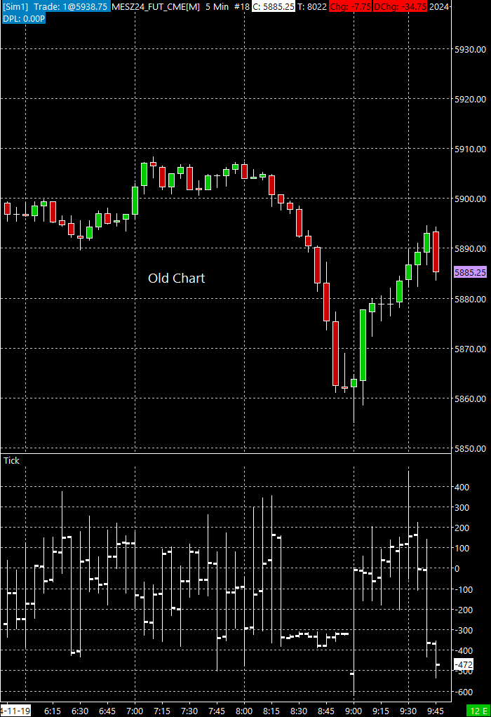 I have 2 charts the old which displays correctly and I created a new chart. Both charts are MESZ24_FUT_CME 5 minute charts. New Chart https://www.sierrachart.com/image.php?Image=1732027649177.png Old Chart https://www.sierrachart.com/image.php?Image=173202772821.png In my opinion the problem lies in the Add Additional Symbol study. Date Time Of Last Edit: 2024-11-19 14:59:57