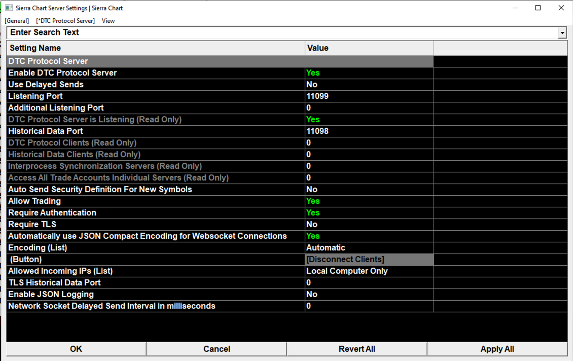 Hi, I am using a Python Client to connect to Sierra Chart DTC Server using websockets. For the past 2 weeks I have tried several times to logon and download historical price data from the DTC Server's Historical Data Port. I am using port 11098 as the Historical Data Port and port 11099 as the listening port (See attached screenshort). I can successfully logon to port 11099 and receive "MARKET_DATA_SNAPSHOT" and "MARKET_DATA_UPDATE_BID_ASK" realtime data as shown below on the "Python Client Log for Market Data" section. However, I am unable to logon to Historical Data Port 11098 as shown below on the "Python Client Log for Historical Data" and "Sierra Chart - Message Log sections". It seems port 11098 is blocked or restricted on Sierra Chart because the python client is interpreting the historical port as "closed" whilst the Sierra Chart DTC Server is waiting for the LOGON_REQUEST message and then "Timing out". The LOGON_REQUEST message is sent but is not being accepted or received. Sierra Chart version number - 2695 Service Package - Base Advanced For DTC Server settings please see attached screenshot. I am using JSON Compact Encoding for Websocket Clients Any assistance will be greatly appreciated. ******************** Python Client Log for LOGON_REQUEST and MARKET_DATA_REQUEST on port 11099 ********************* 2024-11-19 11:56:56,138 - DTC_Client - INFO - Connecting to ws://localhost:11099 start_listening -> on_open.... 2024-11-19 11:56:56,751 - DTC_Client - INFO - On open DTCClient --> send --> message.to_JSON(): {"ClientName": "DTC Client", "HeartbeatIntervalInSeconds": 60, "Password": "XXXXXXXXX", "ProtocolVersion": 8, "TradeMode": 3, "Type": 1, "Username": "XXXXXXXXXX"} example_client_1 --> ix: 0 symbol: {'name': 'EURUSD', 'ID': 2274118876} DTCClient --> send --> message.to_JSON(): {"RequestAction": 1, "Symbol": "EURUSD", "SymbolID": 2274118876, "Type": 101} MarketDataSnapshot -> BidPrice: 1.0562200546264648 MarketDataUpdateBidAskCompact -> BidPrice: 1.0562299489974976 MarketDataUpdateBidAskCompact -> BidPrice: 1.0562299489974976 ******************* Python Client Log for LOGON_REQUEST and HISTORICAL_PRICE_DATA_REQUEST on port 11098 **************** 024-11-19 12:20:36,292 - DTC_Client - INFO - Connecting to ws://localhost:11098 2024-11-19 12:20:36,313 - DTC_Client - INFO - On open_history DTCClient --> send --> message.to_JSON(): {"ClientName": "DTC Client", "HeartbeatIntervalInSeconds": 60, "Password": "XXXXXXXXX", "ProtocolVersion": 8, "TradeMode": 3, "Type": 1, "Username": "XXXXXXXXX"} 2024-11-19 12:20:47,359 - DTC_Client - ERROR - Error historyConnection is already closed. 2024-11-19 12:20:47,359 - DTC_Client - INFO - On close_history 2024-11-19 12:20:47,359 - DTC_Client - ERROR - Connection ws://localhost:11098 stopped. Restarting... 2024-11-19 12:20:52,375 - DTC_Client - INFO - Connecting to ws://localhost:11098 2024-11-19 12:20:52,390 - DTC_Client - INFO - On open_history DTCClient --> send --> message.to_JSON(): {"ClientName": "DTC Client", "HeartbeatIntervalInSeconds": 60, "Password": "XXXXXXXXX", "ProtocolVersion": 8, "TradeMode": 3, "Type": 1, "Username": "XXXXXXXXX"} 2024-11-19 12:21:03,421 - DTC_Client - ERROR - Error historyConnection is already closed. ************************* Sierra Chart - Message Log for Historical Data Logon on port 11098 ************************** 2024-11-19 12:20:36.313 | HD Server Manager | Incoming connection from IP: 127.0.0.1 2024-11-19 12:20:36.315 | HD Server Manager | Started new historical data server. Count=1 2024-11-19 12:20:36.322 | HD Server | Thread:5684 (3) | Creating socket. 2024-11-19 12:20:36.322 | HD Server | Thread:5684 (3) | New receive buffer size: 262144 2024-11-19 12:20:36.322 | HD Server | Thread:5684 (3) | Allocated send buffers: 32 of 4096 bytes. 2024-11-19 12:20:36.322 | WSServer | HD Server | Thread:5684 (3) | Start Server 2024-11-19 12:20:36.323 | WSServer | HD Server | Thread:5684 (3) | Switch to HANDSHAKE 2024-11-19 12:20:36.323 | WSServer | HD Server | Thread:5684 (3) | Switch to READY_DATA 2024-11-19 12:20:36.323 | WSServer | HD Server | Thread:5684 (3) | Response HANDSHAKE with status code 101 2024-11-19 12:20:47.360 | HD Server | Timed out waiting for logon request. | Thread:5684 2024-11-19 12:20:47.360 | HD Server | Thread:5684 (3) | CloseSocket call. 2024-11-19 12:20:47.361 | HD Server | Thread:5684 (3) | Shutdown started. Waiting for graceful close. 2024-11-19 12:20:47.361 | HD Server | Thread:5684 (0) | CloseSocket call. 2024-11-19 12:20:47.362 | HD Server | Thread:5684 (3) | Socket gracefully closed by remote side. 2024-11-19 12:20:47.362 | HD Server | Thread:5684 (3) | Closed. 2024-11-19 12:20:47.422 | HD Server | Server thread ending. Closing socket. | Thread:5684 2024-11-19 12:20:47.423 | HD Server Manager | Current server count=0 2024-11-19 12:20:52.384 | HD Server Manager | Incoming connection from IP: 127.0.0.1 2024-11-19 12:20:52.385 | HD Server Manager | Started new historical data server. Count=1 2024-11-19 12:20:52.391 | HD Server | Thread:5664 (3) | Creating socket. 2024-11-19 12:20:52.391 | HD Server | Thread:5664 (3) | New receive buffer size: 262144 2024-11-19 12:20:52.391 | HD Server | Thread:5664 (3) | Allocated send buffers: 32 of 4096 bytes. 2024-11-19 12:20:52.392 | WSServer | HD Server | Thread:5664 (3) | Start Server 2024-11-19 12:20:52.392 | WSServer | HD Server | Thread:5664 (3) | Switch to HANDSHAKE 2024-11-19 12:20:52.392 | WSServer | HD Server | Thread:5664 (3) | Switch to READY_DATA 2024-11-19 12:20:52.392 | WSServer | HD Server | Thread:5664 (3) | Response HANDSHAKE with status code 101 2024-11-19 12:21:03.422 | HD Server | Timed out waiting for logon request. | Thread:5664 2024-11-19 12:21:03.422 | HD Server | Thread:5664 (3) | CloseSocket call. 2024-11-19 12:21:03.423 | HD Server | Thread:5664 (3) | Shutdown started. Waiting for graceful close. 2024-11-19 12:21:03.423 | HD Server | Thread:5664 (0) | CloseSocket call. 2024-11-19 12:21:03.425 | HD Server | Thread:5664 (3) | 