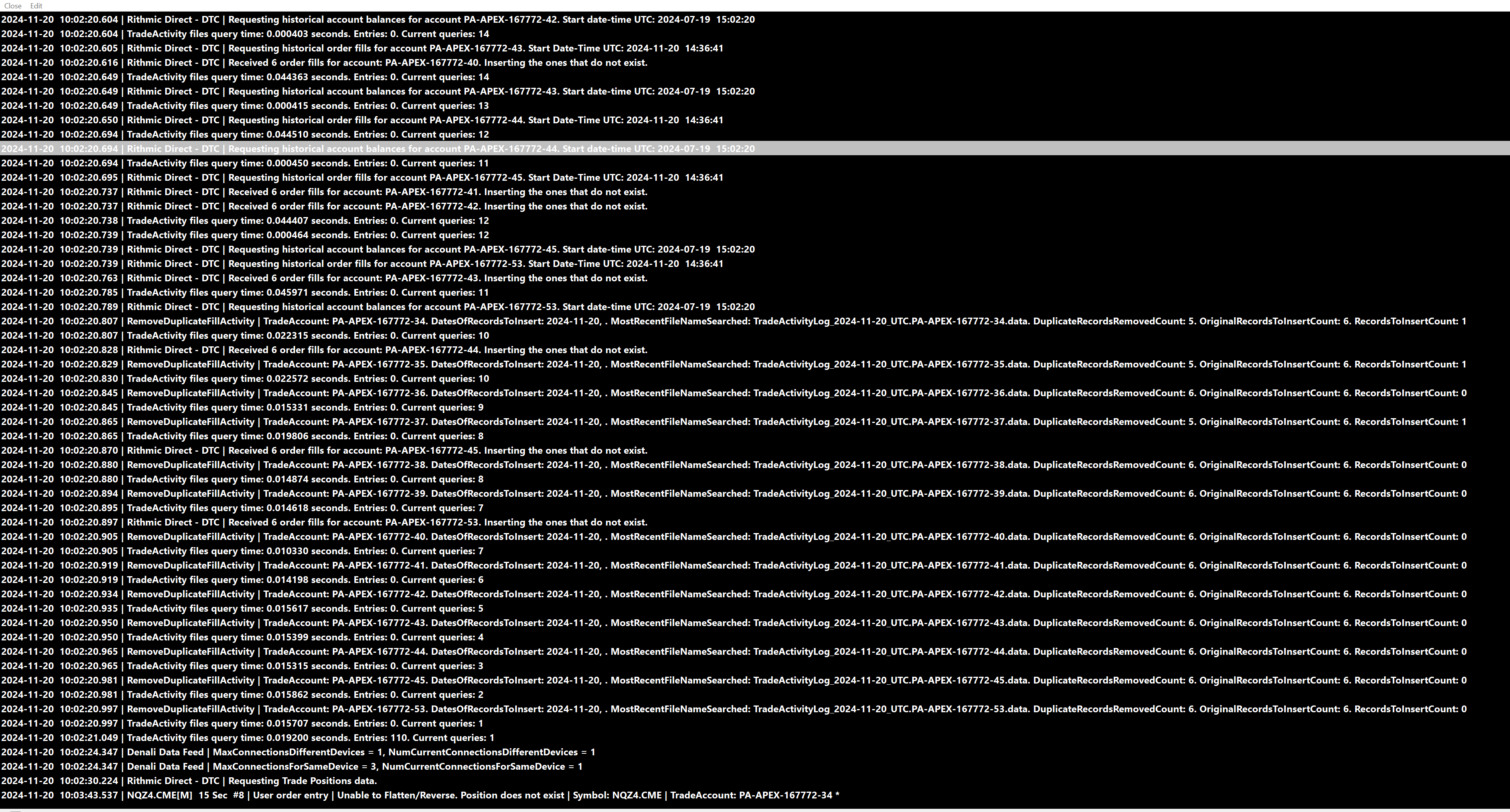 Regarding the first post, what you need to do is stop using Rithmic. Do not use Rithmic. Makes completely no sense whatsoever. Regarding the last post, do not involve Rithmic at all when copying trades. Otherwise you will have problems. It is that simple. It is unreliable. Completely unreliable. And it is not the fault of Sierra Chart. Using Rithmic makes no sense at all. Sierra Chart Support - Engineering Level Your definitive source for support. Other responses are from users. Try to keep your questions brief and to the point. Be aware of support policy: https://www.sierrachart.com/index.php?l=PostingInformation.php#GeneralInformation For the most reliable, advanced, and zero cost futures order routing, use the Teton service: Sierra Chart Teton Futures Order Routing Date Time Of Last Edit: 2024-11-30 18:40:44