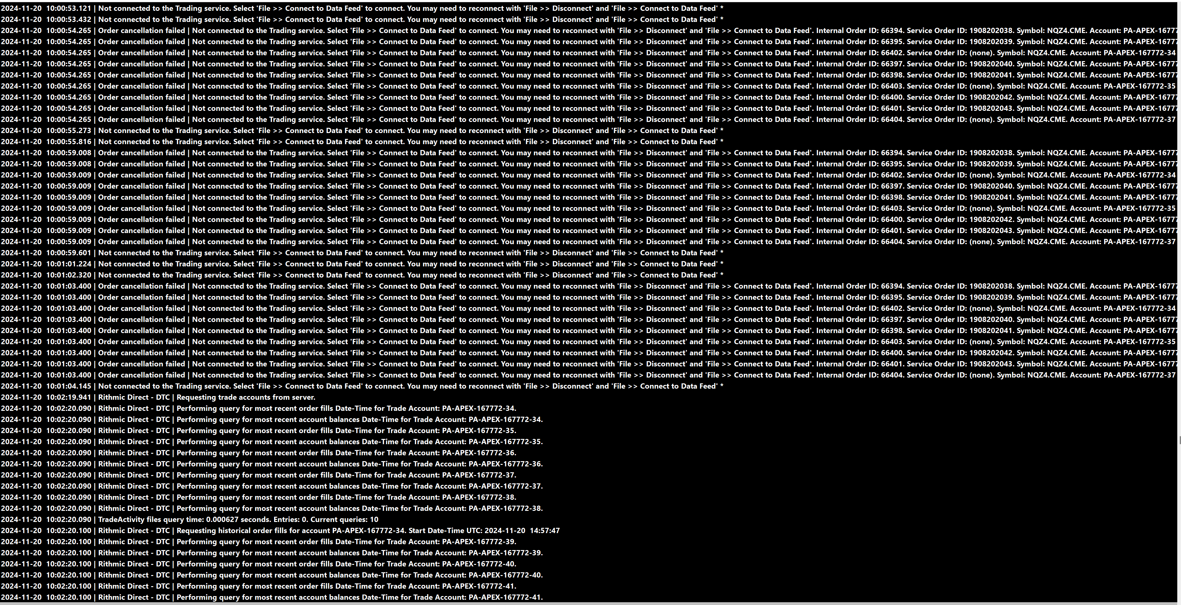 Hello, I am having a problem is trading my APEX PA accounts on Sierra charts. Late last week i had a trade on and hit flatten to close and the bracket order did not get canceled when i closed the trade. Yesterday i was copy trading a group of 13 Apex PA accounts when i got stopped out 7 of the 13 kept treading and the accounts got blown without me even knowing there was an open trade on... Just now i tried to close a trade with 3 accounts linked and it would not close. the charts also froze up and when it did close i was at a loss even though the chart had me at a profit.... I updated it this morning before i started trading. My PC is up to date I have no clue what to do!!!! |