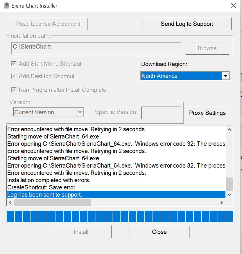 The Windows Error 32 means that a file is in use and therefore the installer can not copy the file from the temporary location to the final location. Make sure you have exited from any sub-instances of Sierra Chart and that you start the installer by selecting "Help >> Install Current Version". When you do this, the currently running Sierra Chart will exit and the installer will run. At this time, you should have no Sierra Chart software running. Then perform the installation. If you continue to have an issue, then let us know. For the most reliable, advanced, and zero cost futures order routing, use the Teton service: Sierra Chart Teton Futures Order Routing |