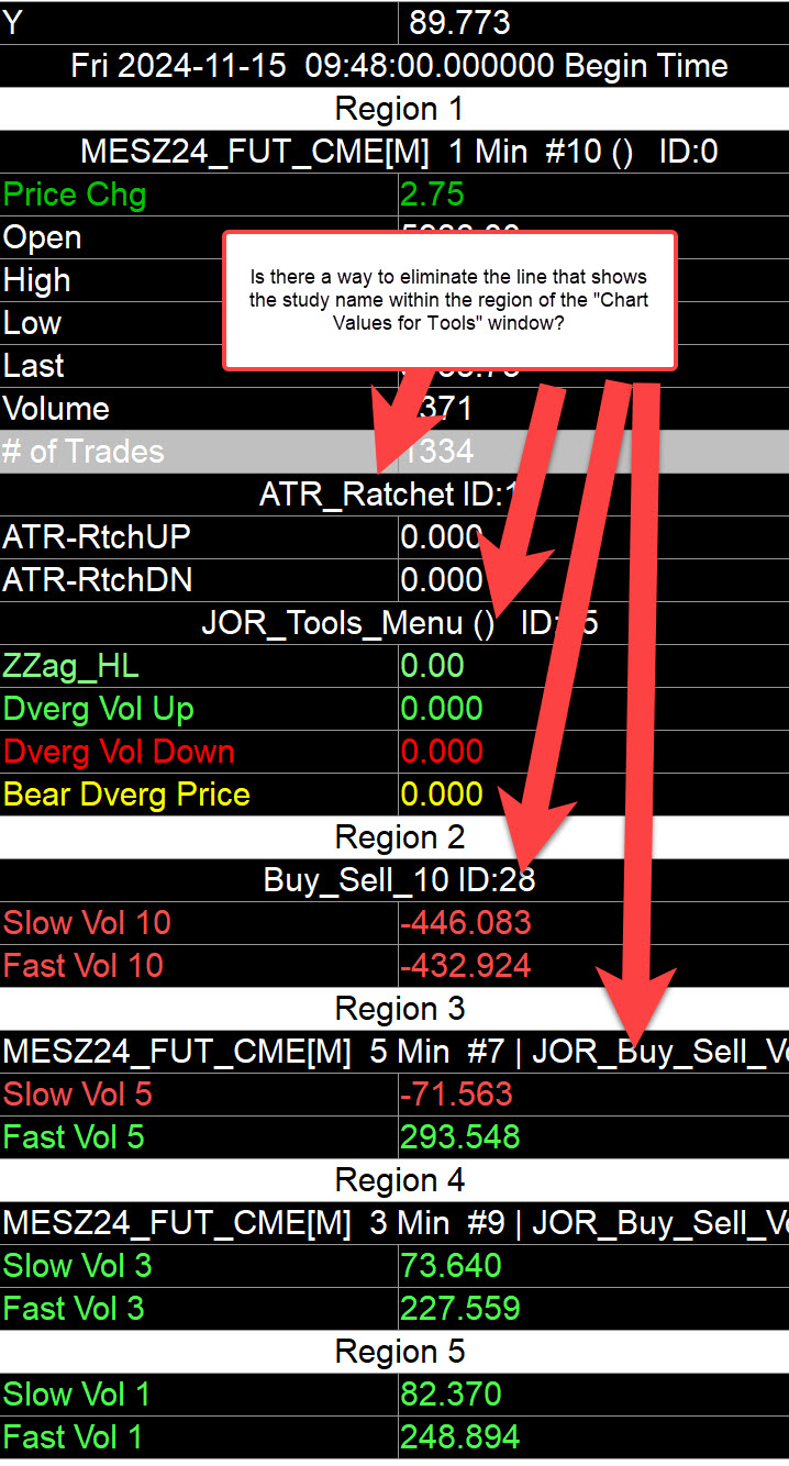 I have a chart the uses the Overlay study to get the same study from different charts (timeframes). I want to eliminate the study name line, for each of them. As you can see in the Chart Values for Tools window of the original chart, they do not appear. I have tried both options on the overlay study Yes_No for "Use Subgraph name/Value related Display Setting from Source Study" Update - reg 5 is using the same study but for local chart - not using Overlay study. It does not have the study name line. Guidance appreciated JohnR Date Time Of Last Edit: 2024-11-22 18:49:07