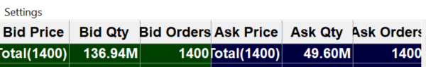 I know how the scale works. Here is an old post where someone had issuses with an infinite level of depth. DOM Graph depth cannot be limited - graph gets swamped out I would like to unlock the actual infinite levels not only the max. 1400 levels is what i can see now. It is confirmed in the MArket Depth Window. Alternatively, how can I change the global symbol settings or tick settings or something so that 1400 level would show more price then currently? I only care about the resting orders approximate location. dont need to be accurate. Thank you. |