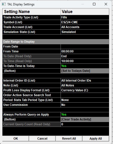Good morning, I am not able to record trades and have them appear in the Trade Activity Log. In the chart if the entry and exit positions are marked, however, in the Trade Activity Log they do not appear. I have checked the configuration of TAL to see if there was any filter, but no. I can't see them. What's more, before it did register the trades and since a couple of weeks ago, it did not. |