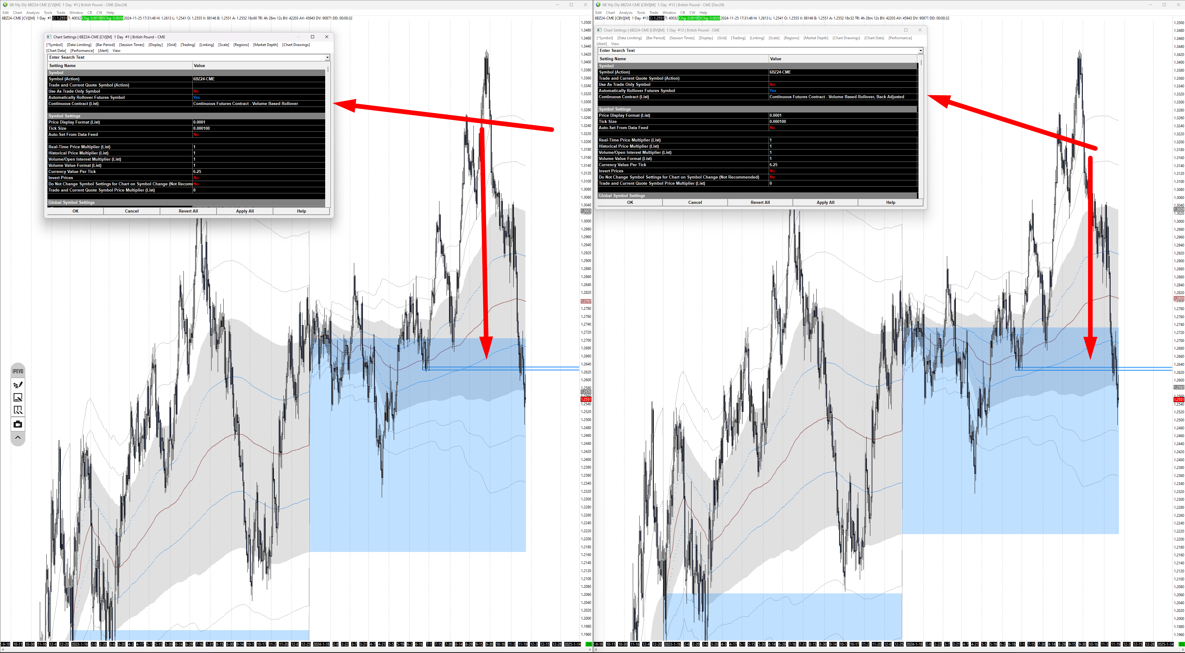In part (continuous contract), there is no difference between the selected items. I will take pictures of both situations and send them to you. This problem exists in all trading symbols, including 6B and 6E and ES |