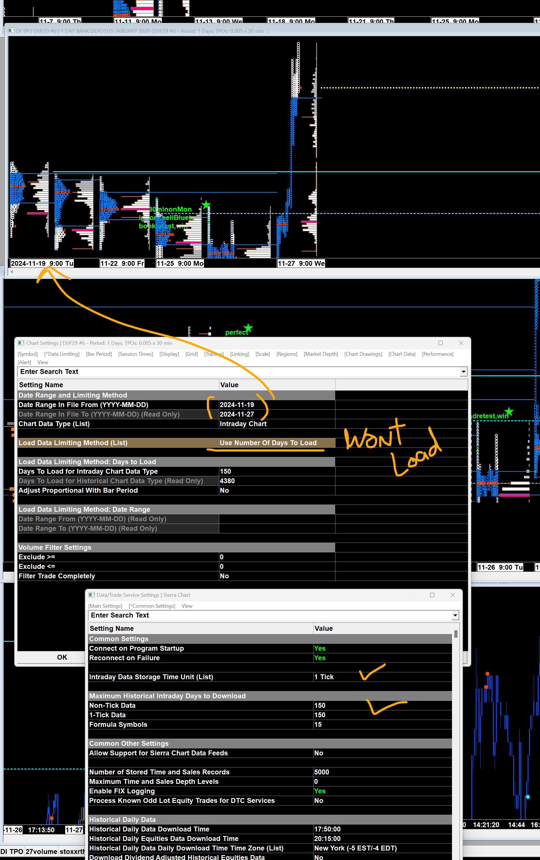 John, I have done something horrible and I can't fix it!!! I tried googling and solving issue myself. I went into Data/trade settings and set it to 1 min from 1 tick re deleted and reloaded data. I got it to go way back a few years, but the tpo charts went weird so I tried to reverse what I had done. Now as you see from screenshot, no matter what I do I can't get data to load past a week ago! You see it is set to #of days to load, but it ignores it and goes to the data range. I have tried deleting and reloading data and nothing works. The chart is stuck on a few recent days of data do matter what I do. Please help me I have tried everything. Karen |