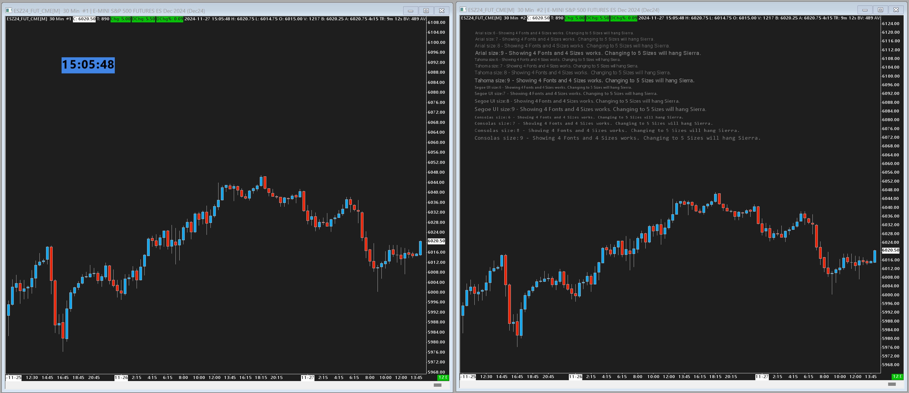 4 Fonts and 5 Sizes hangs Sierra with sc.Graphics.DrawTextAt() 4 Fonts and 4 Sizes works as expected. I created a small sample to easily look at some different fonts and sizes. Much to my surprise, this trivial code causes Sierra to hang. Sometimes you might see one or two clicks or hovers with mouse or keyboard events work, but they might also take minutes to respond. During this time, charts and data will update as seen by the real-time clock, price updates, and file/network updates from Sysintenrals Process Monitor, but you cannot interact with the charts or the Sierra menus. Attached is an image showing 2 charts. The first/left one has the clock to see what's updating. The second/right has a custom study built with the code below. REPRO and IMPORTANT INFO: Close all other Chartbooks before running this repro. Create a new chartbook up with 2 charts like the repro image and SAVE it. Build/Add the custom study to see (at least on my machine) 4 fonts and 4 sizes working. (the defaults are 1 and 1 to ensure creation works first time) SAVE this version of the chartbook. Edit the study to show 4 fonts and 5 sizes. (other combos might break Sierra as well) Hit OK to close all the dialogs... RESULT: Sierra will now be hung and will need to be terminated from Task Manager Code to repro the issue: #include "sierrachart.h" #include <vector> using namespace std; SCDLLName("Sierra Font Sample"); namespace ns_zzz_TestSierraFonts { static std::vector<SCString> FontNames = { "Arial" , "Tahoma" , "Segoe UI" , "Consolas" , "Courier New" }; static std::vector<int> FontSizes = { 6 ,7 ,8 ,9 ,10 ,11 ,12 }; // // DrawToChart // void DrawToChart(HWND WindowHandle, HDC DeviceContext, SCStudyInterfaceRef sc) { const int region_left = sc.StudyRegionLeftCoordinate; const int region_top = sc.StudyRegionTopCoordinate; const char* OutputFormatString = "%s size:%d - Showing 4 Fonts and 4 Sizes works. Changing to 5 Sizes will hang Sierra."; sc.Graphics.SetTextAlign(TA_NOUPDATECP); SCString output; int x = region_top + 50; int y = region_left + 50; n_ACSIL::s_GraphicsColor backgroundColor; backgroundColor.SetColorValue(sc.ChartBackgroundColor); n_ACSIL::s_GraphicsColor textColor; textColor.Color.RawColor = COLOR_GRAY; sc.Graphics.SetTextColor(textColor); sc.Graphics.SetBackgroundMode(TRANSPARENT); SCInputRef Input_NumFonts = sc.Input[0]; SCInputRef Input_NumSizes = sc.Input[1]; int fontIndex = 0; int sizeIndex = 0; for (auto& font : FontNames) { n_ACSIL::s_GraphicsFont graphicsFont; graphicsFont.m_FaceName = font; sizeIndex = 0; for (auto& size : FontSizes) { output.Format(OutputFormatString, font.GetChars(), size); graphicsFont.m_Height = size; sc.Graphics.SetTextFont(graphicsFont); n_ACSIL::s_GraphicsSize graphicsSize; sc.Graphics.GetTextSize(output, graphicsSize); n_ACSIL::s_GraphicsRectangle rect; rect.Left = x; rect.Top = y; rect.Right = x + graphicsSize.Width; rect.Bottom = y + graphicsSize.Height; sc.Graphics.FillRectangleWithColor(rect, backgroundColor); sc.Graphics.DrawTextAt(output, x, y); // y += graphicsSize.Height + 4; ++sizeIndex; if (sizeIndex >= FontSizes.size() || sizeIndex >= Input_NumSizes.GetInt()) break; } ++fontIndex; if (fontIndex >= FontNames.size() || fontIndex >= Input_NumFonts.GetInt()) break; } } // // scsf_zzz_TestSierraFonts // SCSFExport scsf_zzz_TestSierraFonts(SCStudyInterfaceRef sc) { SCInputRef Input_NumFonts = sc.Input[0]; SCInputRef Input_NumSizes = sc.Input[1]; if (sc.SetDefaults) { sc.GraphName = "zzz_TestSierraFonts"; sc.AutoLoop = 0; sc.DrawZeros = 0; sc.GraphRegion = 0; sc.DrawStudyUnderneathMainPriceGraph = 0; sc.UpdateAlways = 1; Input_NumFonts.Name = "Num Fonts"; Input_NumFonts.SetInt(1); Input_NumFonts.SetIntLimits(1, 5); Input_NumSizes.Name = "Num Sizes"; Input_NumSizes.SetInt(1); Input_NumSizes.SetIntLimits(1, 7); return; } sc.p_GDIFunction = DrawToChart; for (int barIndex = sc.UpdateStartIndex; barIndex < sc.ArraySize; barIndex++) { // do work... } } } // ns_zzz_TestSierraFonts |