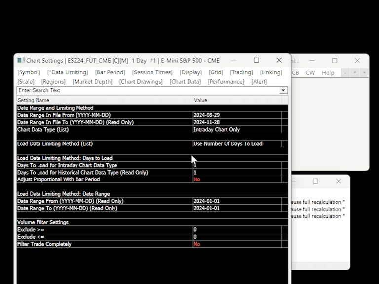 if the chart contains only 1 bar there is a silent recalculation infinite loop, causing ui glitching and preventing any custom study from submitting orders e.g. a chart with 1 days to load and 1-0-0-0 bar period have a minimum of 2 bars to resolve documenting incase anyone else runs into this in the future; it's a proper headache to diagnose keywords: sc.IsFullRecalculation, SCT_SKIPPED_FULL_RECALC, Order entry skipped because full recalculation Date Time Of Last Edit: 2024-11-28 20:54:50