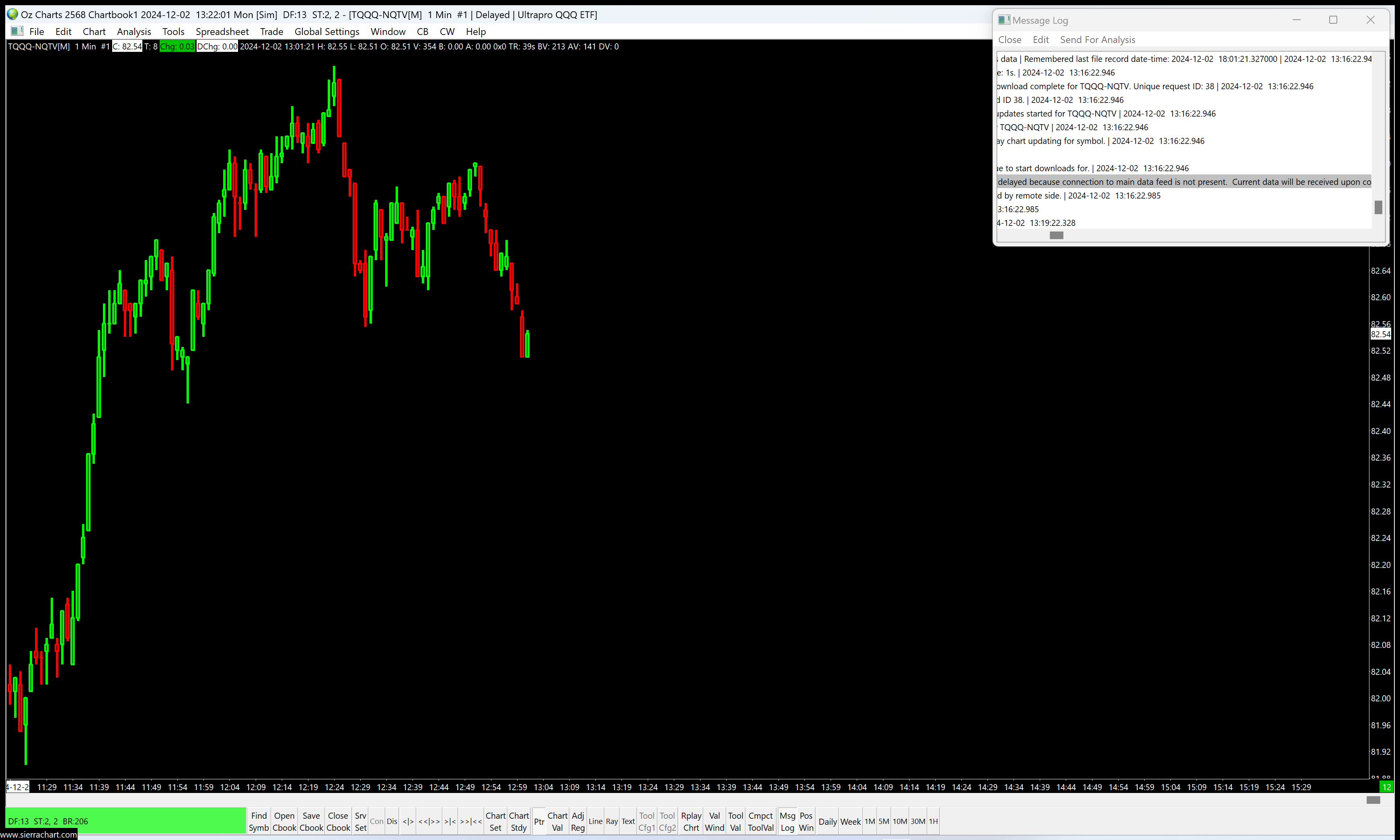 I tried the support board suggestion to close all chartbooks, open a new chart & connect, then disconneect. Data still delayed. Any suggestions? Thank you! https://www.sierrachart.com/image.php?Image=1733163724952.png Software version: 2568 64-bit | 2024-12-02 13:23:19.383 Primary Thread ID: 6176 | 2024-12-02 13:23:19.383 Usage end date: 2025-01-02 | 2024-12-02 13:23:19.383 Enabled for: Advanced Features 2. | 2024-12-02 13:23:19.383 Enabled for: Sierra Chart Historical Data Service. | 2024-12-02 13:23:19.383 Enabled for: Denali Real-Time Exchange Data Feed. | 2024-12-02 13:23:19.383 Enabled for: Delayed Denali Exchange Data Feed. | 2024-12-02 13:23:19.383 Allow Support for Sierra Chart Data Feeds is enabled. | 2024-12-02 13:23:19.383 Current selected Data/Trading service: SC Data - All Services | 2024-12-02 13:23:19.383 Custom symbol settings values: enabled | 2024-12-02 13:23:19.383 Chart Update Interval: 500 | 2024-12-02 13:23:19.383 Intraday Data Storage Time Unit: 0 | 2024-12-02 13:23:19.383 Time Zone: -05:00:00 (EST-05EDT+01,M3.2.0/02:00,M11.1.0/02:00) | 2024-12-02 13:23:19.383 2024-12-02 18:23:19 Local computer time in UTC | 2024-12-02 13:23:19.383 2024-12-02 13:23:19 Local computer time in SC Time Zone | 2024-12-02 13:23:19.383 2024-12-02 18:05:24 Server time in UTC | 2024-12-02 13:23:19.383 Local computer UTC time and Server UTC time difference: 0 seconds. | 2024-12-02 13:23:19.383 Program path: C:\SierraChart\ | 2024-12-02 13:23:19.383 Data Files path: C:\SierraChart\Data\ | 2024-12-02 13:23:19.383 OS Version Number: 10.0 | 2024-12-02 13:23:19.383 Locale Setting: C | 2024-12-02 13:23:19.383 DLLs: aaaOzTestStudy99_64.dll, SC_ACSIL_Examples.dll, UserContributedStudies_64.dll | 2024-12-02 13:23:19.383 Allowed protected custom studies: | 2024-12-02 13:23:19.383 Crash reporter started: true | 2024-12-02 13:23:19.383 The message log has been sent to support. | 2024-12-02 13:24:07.371 * HTTPS connection ID:1 to www.sierrachart.com:443 for request ID:1 (1) | Creating socket. Using TLS 1.2. | 2024-12-02 13:24:07.372 HTTPS connection ID:1 to www.sierrachart.com:443 for request ID:1 (1) | New receive buffer size: 0 | 2024-12-02 13:24:07.372 HTTPS connection ID:1 to www.sierrachart.com:443 for request ID:1 (1) | Connecting to IP: 65.108.28.81. | 2024-12-02 13:24:07.372 The Message Log was sent. Result: Message Log received. | 2024-12-02 13:24:08.016 * HTTPS connection ID:1 to www.sierrachart.com:443 for request ID:1 (1) | CloseSocket call. | 2024-12-02 13:24:08.275 HTTPS connection ID:1 to www.sierrachart.com:443 for request ID:1 (1) | Shutdown started. Waiting for graceful close. | 2024-12-02 13:24:08.275 HTTPS connection ID:1 to www.sierrachart.com:443 for request ID:1 (1) | Socket gracefully closed by remote side. | 2024-12-02 13:24:08.430 HTTPS connection ID:1 to www.sierrachart.com:443 for request ID:1 (1) | Closed. | 2024-12-02 13:24:08.431 |