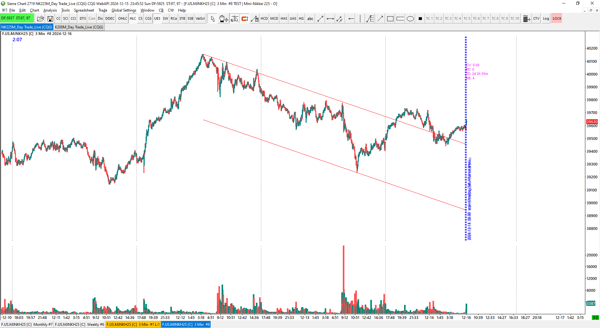 Here's an example from the weekend for symbol MJNK (Mini Nikkei 225). Chart 1 is as of this morning (Monday AM Japan) before the mkt open. You can see the empty space between Sat AM when trading stopped last week and the second blue line (Mon 8:45 AM) when the mkt opens. Chart 2 is just after the open. The empty space has now disappeared but also the example trendlines have also moved because the gap has disappeared. I'm trying to avoid this situation from happening. Chart settings are as follows: - Weekend data set to 'Load Saturday' otherwise I don't get Fri/Sat overnight data - Include weekend columns before first trade is set to 'No' Date Time Of Last Edit: 2024-12-16 01:02:09