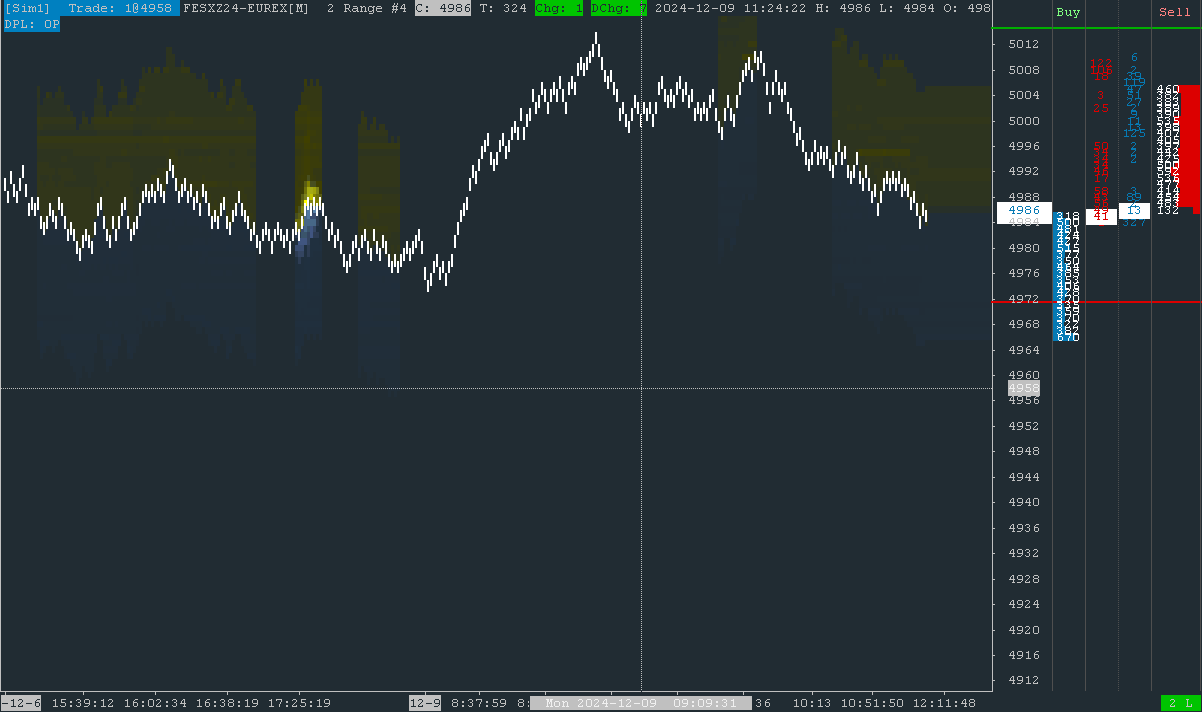 I can see, the images didn't load propperly. I'm sorry I cant upload a version that includes the settings windows ... So here is the chart only: https://www.sierrachart.com/image.php?Image=1733739863659.png Here a description of (in my eyes) relevant settings: Global Settings >> Sierra Chart Server Settings >> General Support Downloading Historical Market Depth Data:Yes Max Historical Market Depth Days to Download:5 Use Separate Connection For Market By Order Data:Yes Use Real-Time Data Compression:Standard Compression Chart Settings >> Data Limiting Chart Data Type:Intraday Chart Load Data Limiting Method:Use Number Of Days To Load Days To Load for Intraday Chart Data Type:2 Market Depth Historical Graph: Default settings |