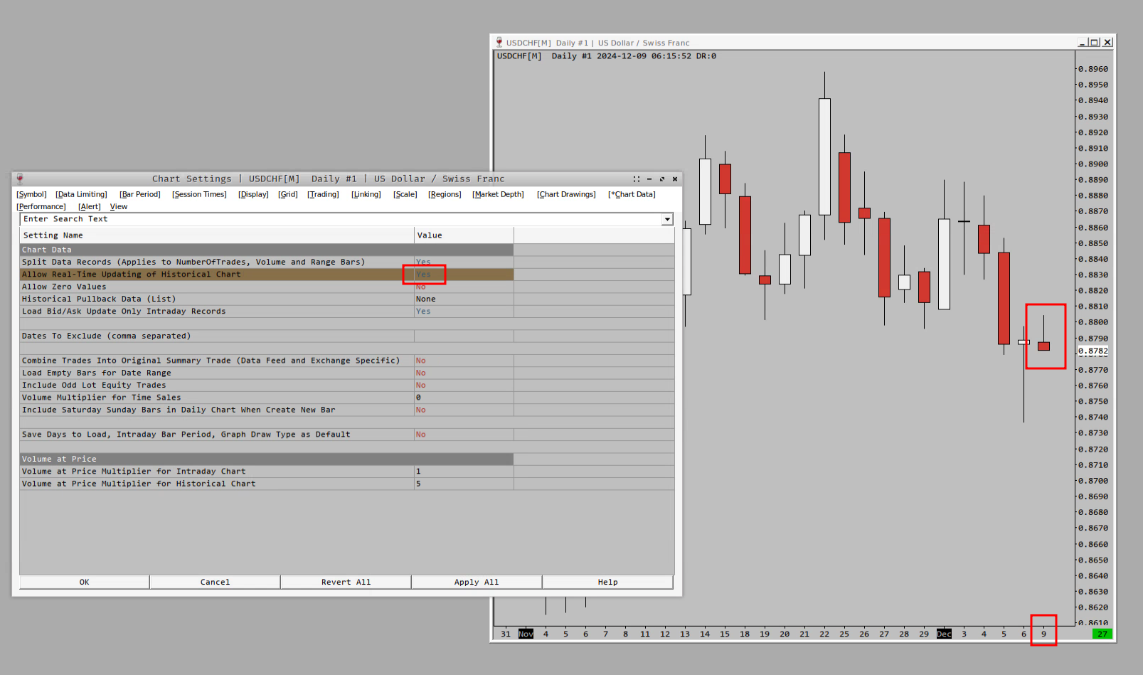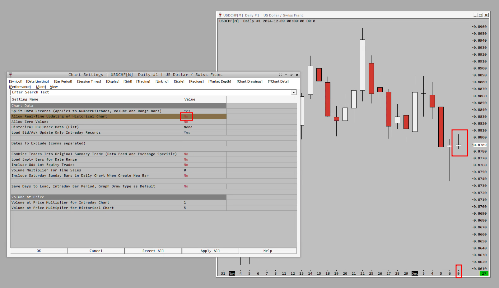 Dear Support, Could you assist me with the following issue? To perform certain calculations on historical charts, I use the setting Chart Settings > Chart Data > Allow Real-Time Updating of Historical Chart set to NO. This is to ensure that the currently developing bar for the current day is not displayed. This works perfectly when the displayed symbol is a futures contract. However, when I try to disable the same option on a chart displaying the historical data of a Forex or Crypto symbol, the chart still shows partial data for the current day and does not exclude it completely. Could you please advise on how to fix this issue? For your reference, I’ve attached two screenshots: One showing the historical daily chart of USDCHF with the option enabled and another showing the same chart with the option disabled. Thank you in advance for your assistance. |
