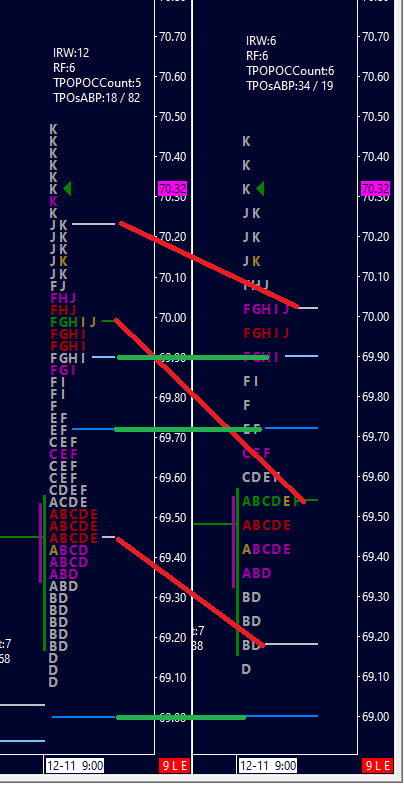I have added a screenshot. Seems the difference comes from the positioning of the POC. The 6 increment one seems to think there was an F period TPO. There was a small price wick exactly at the start of F period that on 6 price increments gets picked up. The functionality is in line with documentation altough a bit confusing. What I would propose is the following: add some pre-processing to calculate POC at maximum resolution (1 tick x time) and then assign it the right bin, then continue from there with the ln:1 settings for tick and continue with existing VA calculations. This would make the 6 price increment then calculate correctly. This makes it critical on days that had double distributions like 11 Dec as such the algo could confuse between the two POC's at higher increments. |