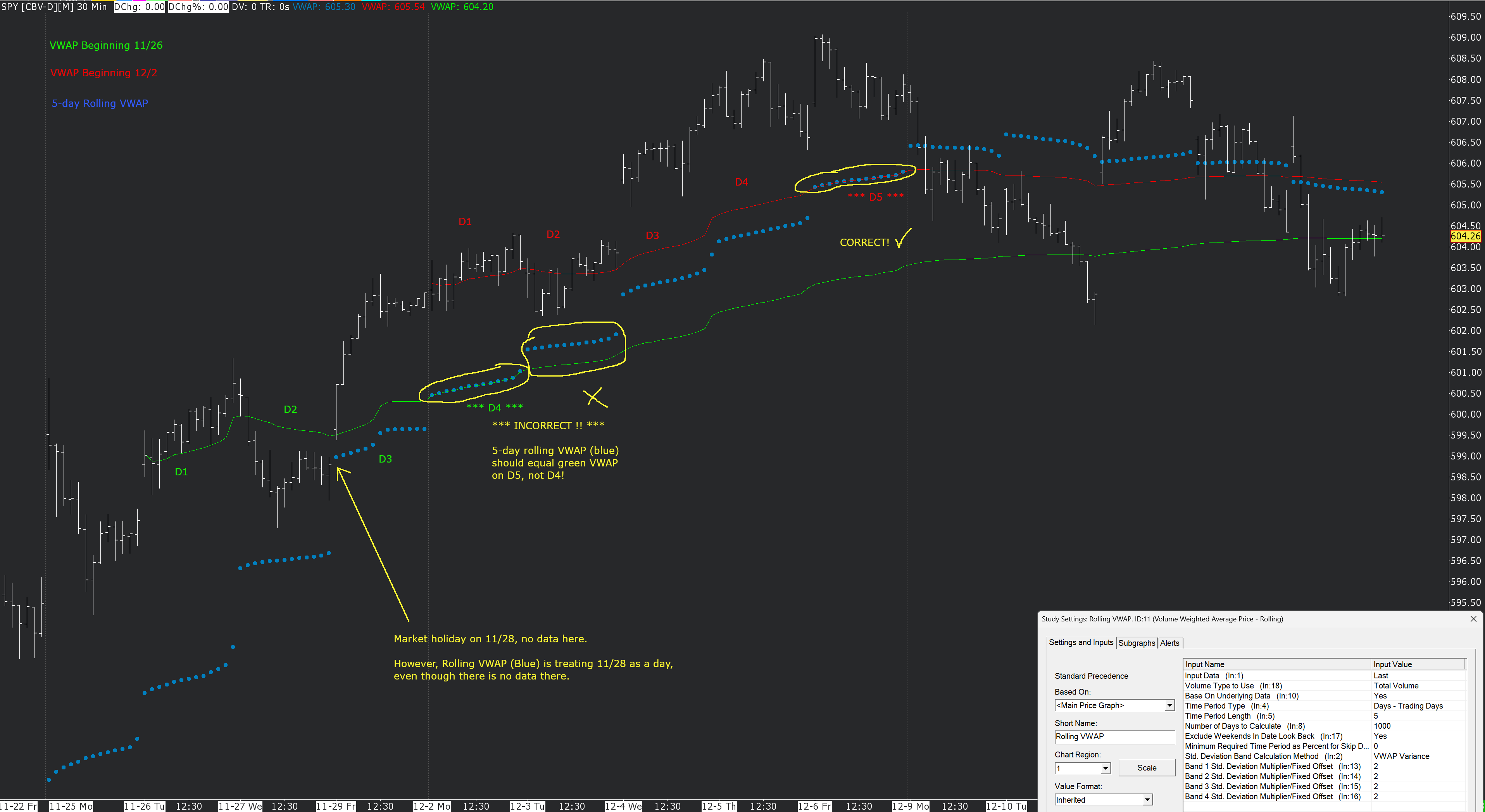Edit: ignore this post. I found after posting that setting the "Minimum Required Time Period as a Percent for Skip Days" option to something like 10, will skip the holidays as expected. I overlooked this option before posting, apologies. The Rolling VWAP study is excellent, as it has the option to skip weekends. However, it does not have the option to skip empty days. VbP study has this option using the "One Period at End of Fixed Time Length - Auto Skip empty days" option. Can Rolling VWAP be modified to add the option to skip empty days? I have attached a screenshot showing how when the Rolling VWAP contains an empty day, it is still counted. Date Time Of Last Edit: 2024-12-15 22:50:53