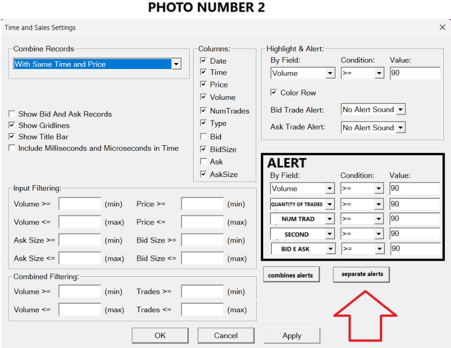 as you can see in the picture I sent, there is the chart at 1 second and I put the settings like this in the trade alert:=AND(V > 30, NT >= 2) i.e. I want a volume of 30 upwards, and number of trades in the same second >=2, so two trades or more in the same second, as you can see in the same picture, I read the time and sales and it gave me an example I was looking for but the indicator didn't, here are the rest of the settings I put in addition to the volume filter of the 1sec chart at 30<=... Nothing appears in the graph, when a yellow dot should appear, could it be because they are on two different price levels? if so, what can I do? it happens that some orders are placed in the same second but on more than one price level, if not this then what is it?