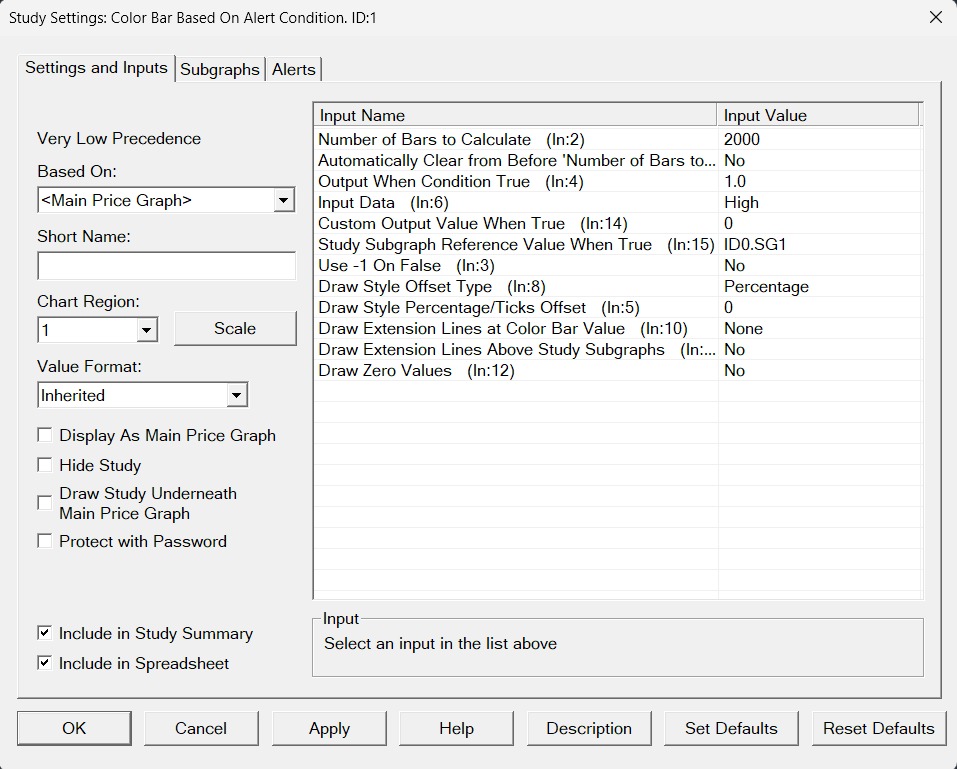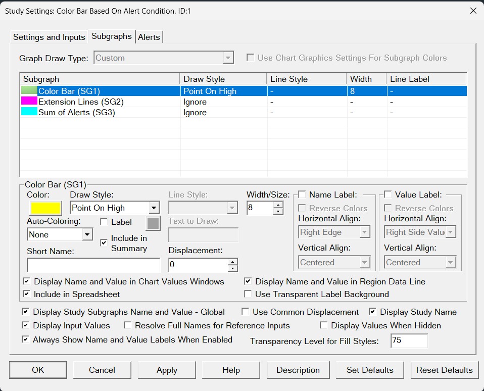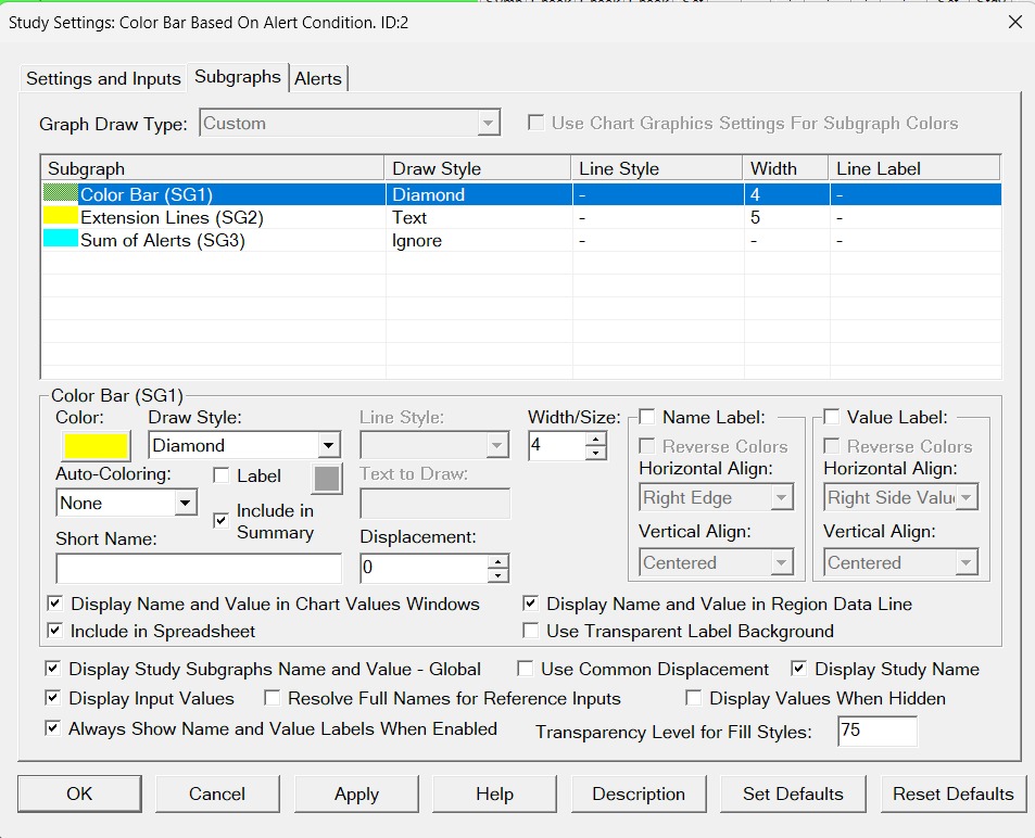 With the Color Bar Based on Alert Condition, what you need to understand is that the item you define in the Subgraph is going to be placed at the location defined by the Input for "Output When Condition True". Therefore, by selecting "Diamond" and having that Input set to "1.0", the diamond will get drawn at a price level of 1. You can do one of two things to fix this: 1. - Set the "Output When Condition True" to be either the "High" or "Low" of the Main Price Graph. - Use whatever Draw Style you want, such as diamond. - Set the "Draw Style Percentage/Ticks Offset" to be some value so that the diamond will be offset from the bar. 2. - Use a Draw Style of "Point on High" or "Point on Low" rather than diamond. This draw style will put a point just above the high/low. For the most reliable, advanced, and zero cost futures order routing, use the Teton service: Sierra Chart Teton Futures Order Routing |