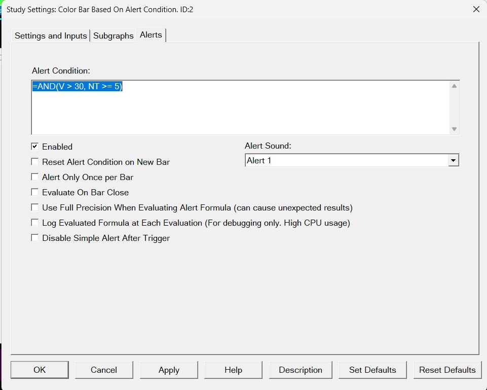 the only thing I don't cpaisoc is where I have to put this formula you gave me =AND(V > 30, NT >= 5), I know I have to put it in the alerts field but how do I connect that with a visual study, forgive me if I don't understand very well and that I am just starting to use sierra and I would like to understand, can you make me a step by step list of what I should do to complete the operation I want to do? i.e.: a signal has to appear when 5 different orders are placed in the same second with volume >30 and NT>1 both bid and ask