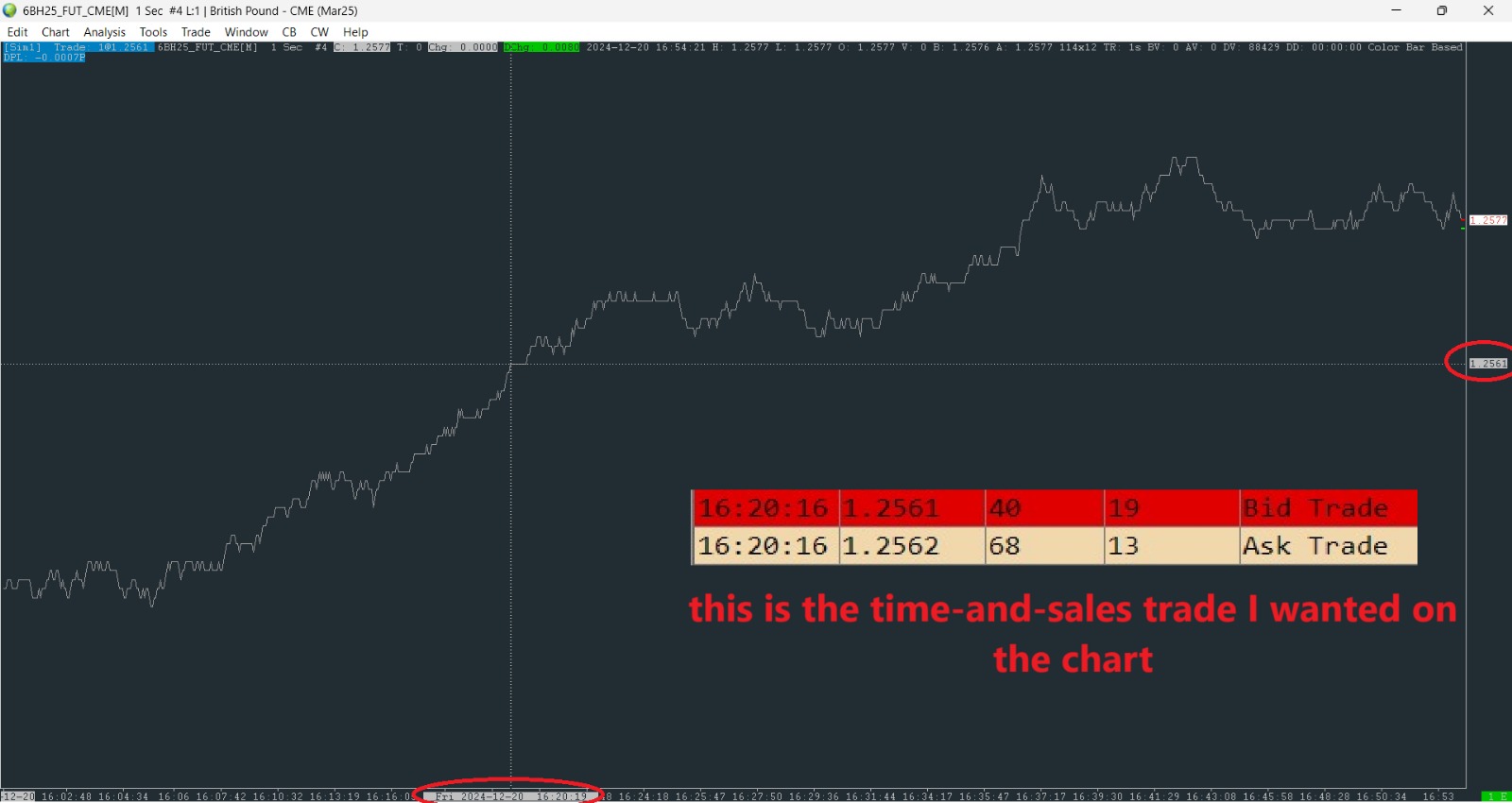 You are trying to find when there is more than one trade with a volume greater than 30 within the same 1 second from the Time and Sales, correct? As we stated, you can not do this within the Time and Sales directly. Therefore, you would need to do it within a Chart. To accumulate the data for the same second you would have a 1 second chart and then setup an alert for that 1 second chart to notify you your conditions are met. The Alert Condition for this is the following: =AND(V > 30, NT > 1) Where V is the Volume and NT is the Number of Trades. Refer to the following: Study/Chart Alerts And Scanning: Available Main Price Graph Identifiers/Variables A constantly updating 1 second chart is going to slow down the system due to the graphics processing. Therefore, we recommend hiding the chart. The Alert will still go off if the conditions are met. Refer to the following: Window, CB and CW Menus: Hide Window (Window) For the most reliable, advanced, and zero cost futures order routing, use the Teton service: Sierra Chart Teton Futures Order Routing |
