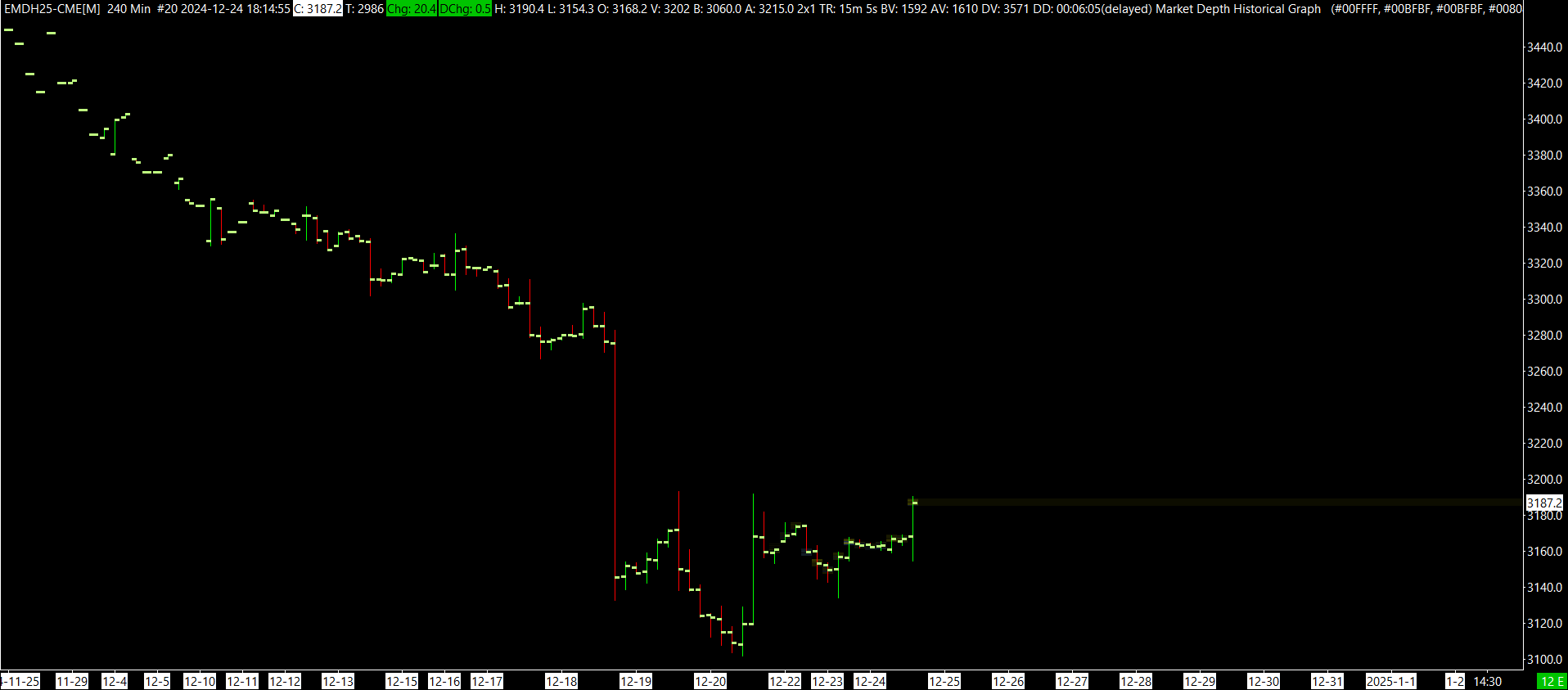 This will not work for U.S. Equities, as you need to pay for the real-time data in order to get the Market Depth data for them. EMDH25-CME should work. What exactly are you seeing with this symbol? Please get us an image of your chart by following these instructions: Support Board Posting Information: Attaching or Posting a Screenshot/Image (Optional) For the most reliable, advanced, and zero cost futures order routing, use the Teton service: Sierra Chart Teton Futures Order Routing |