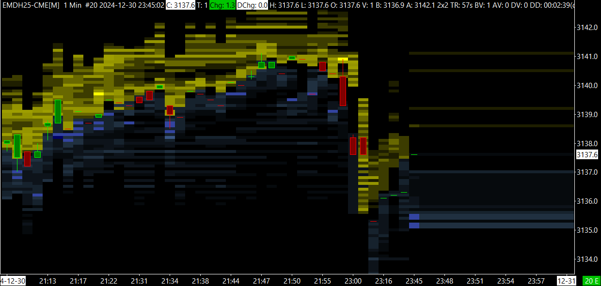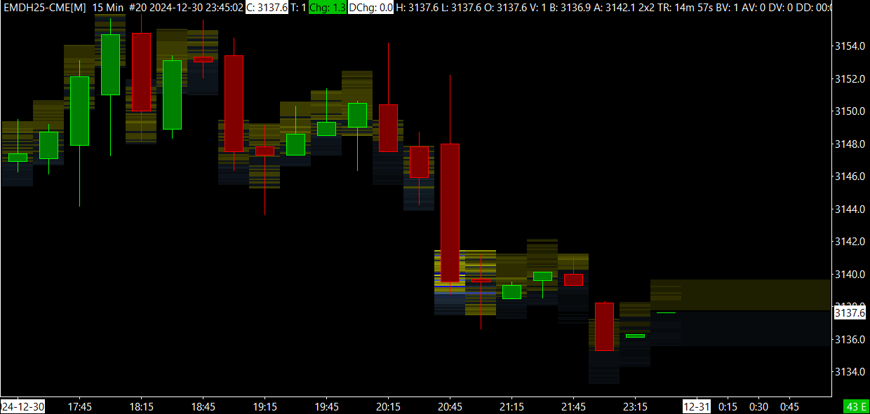 Hello John, With the CME I see nothing on the chart apart from the candlesticks and i do not have any other studies on it. Please see the image is below. Thanks https://www.sierrachart.com/image.php?Image=1735087081589.png |
