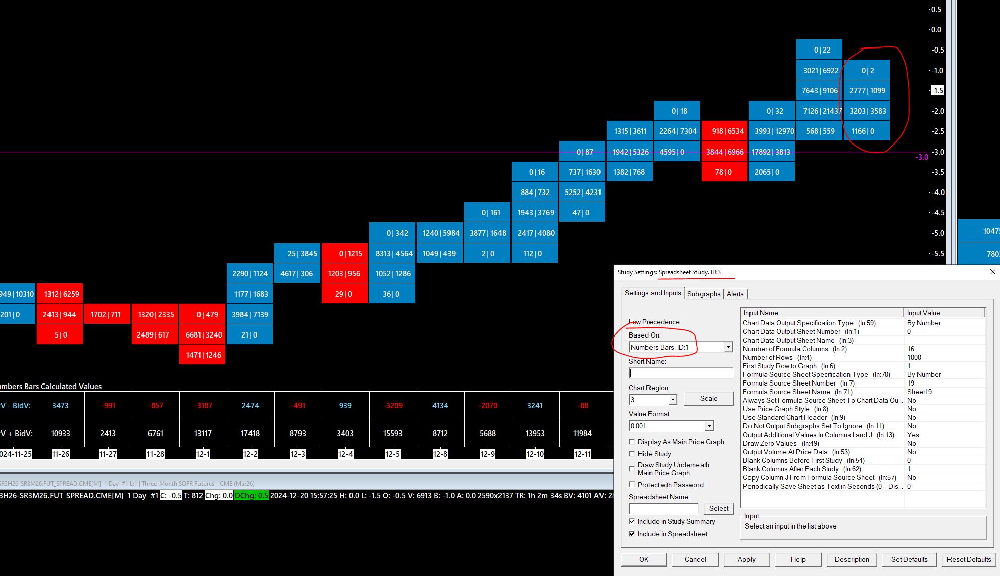 I have had success using the spreadsheet study to download data on chart. However, this one may be a bit complex. I am looking at Number Bars and each column is one day worth of data. I would like to download using the spreadsheet study per trading date the bid and ask volume per each price